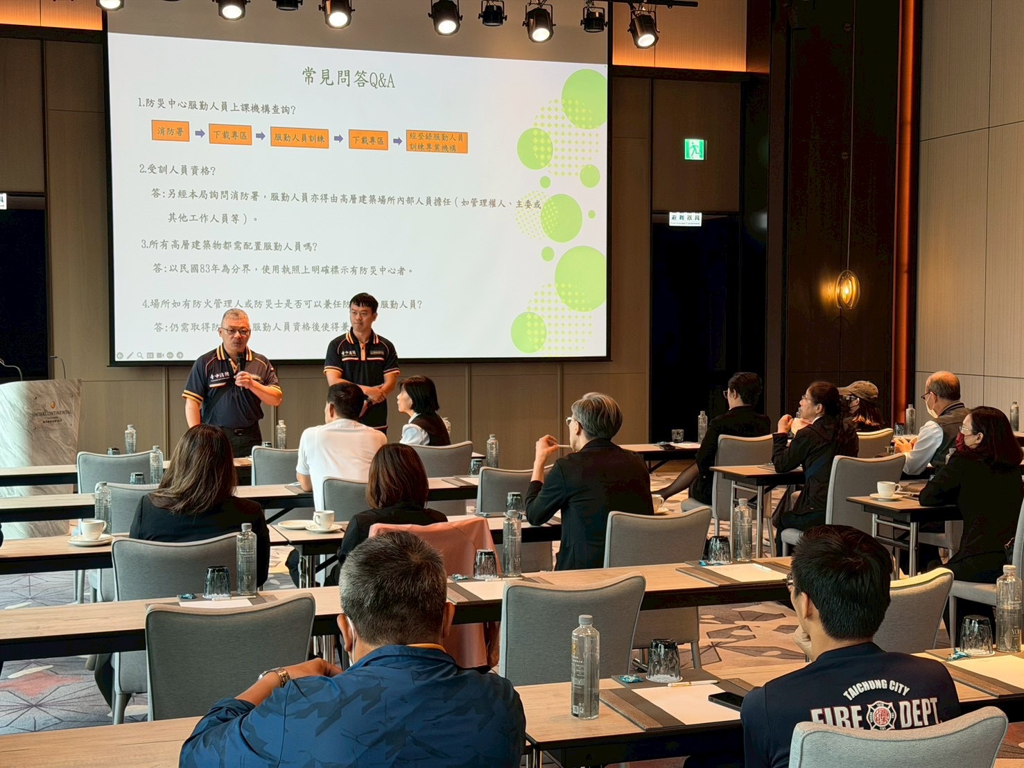因應《消防法》第13條之1修法新制,高層建築物與地下建築物須設置具合格證書之服勤人員,違者將依《消防法》通知限期改善,屆期未改善者,處管理權人新台幣2萬元以上、10萬元以下罰鍰。為提升高層建築物的防災中心及地下建築物的中央管理室服勤人員的應變判斷與操作能力,台中市積極輔導業者並推動訓練與行政指導作業,以結合軟體與硬體設備功能,確保災害發生時能即時監控並採取有效應變措施。