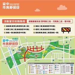建設局進一步說明,配合主場「中央公園」活動,為維持周邊交通秩序,建設局將分兩階段實施交通管制。第一階段自11月1日晚間8時至翌日晚間6時,封閉西屯區僑大八街及經貿五路部分路段;第二階段自11月2日上午6時至晚間6時,啟航路、啟航二路、經貿三路二段、經貿二路、啟航一路及啟航東路將全面封閉,禁止汽機車通行,僅開放活動車輛及救護車進出。活動期間,警方與義交將於重要路口協助疏導與巡查,並嚴格取締違停,確保活動交通安全順暢。(11/1*10)*建設局
