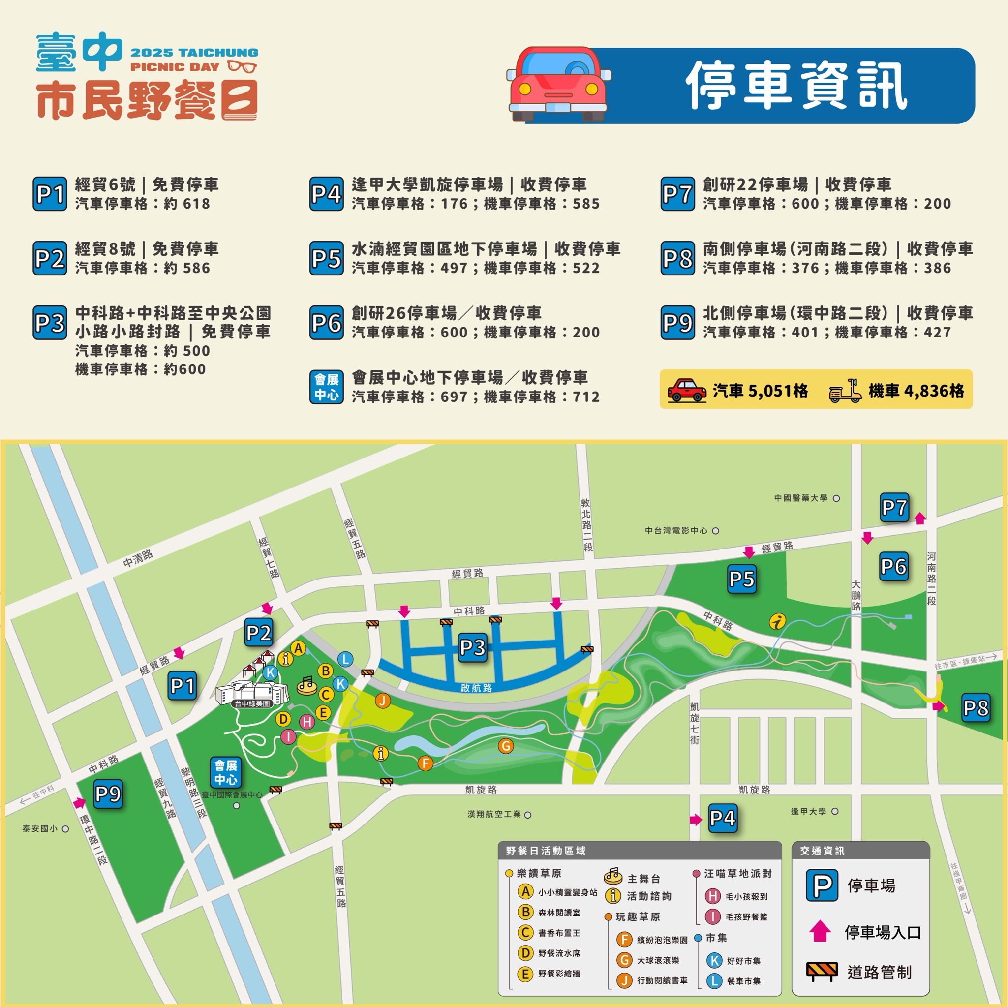 陳局長進一步說明,市府鼓勵民眾盡量利用大眾交通工具前往野餐活動現場。若有自行開車或騎機車的需求,除了公園周邊道路側的停車格外,建設團隊整理了周遭10處停車場,將可提供5,051輛汽車及4,836輛機車的停車空間,讓市民能更加方便的參與。