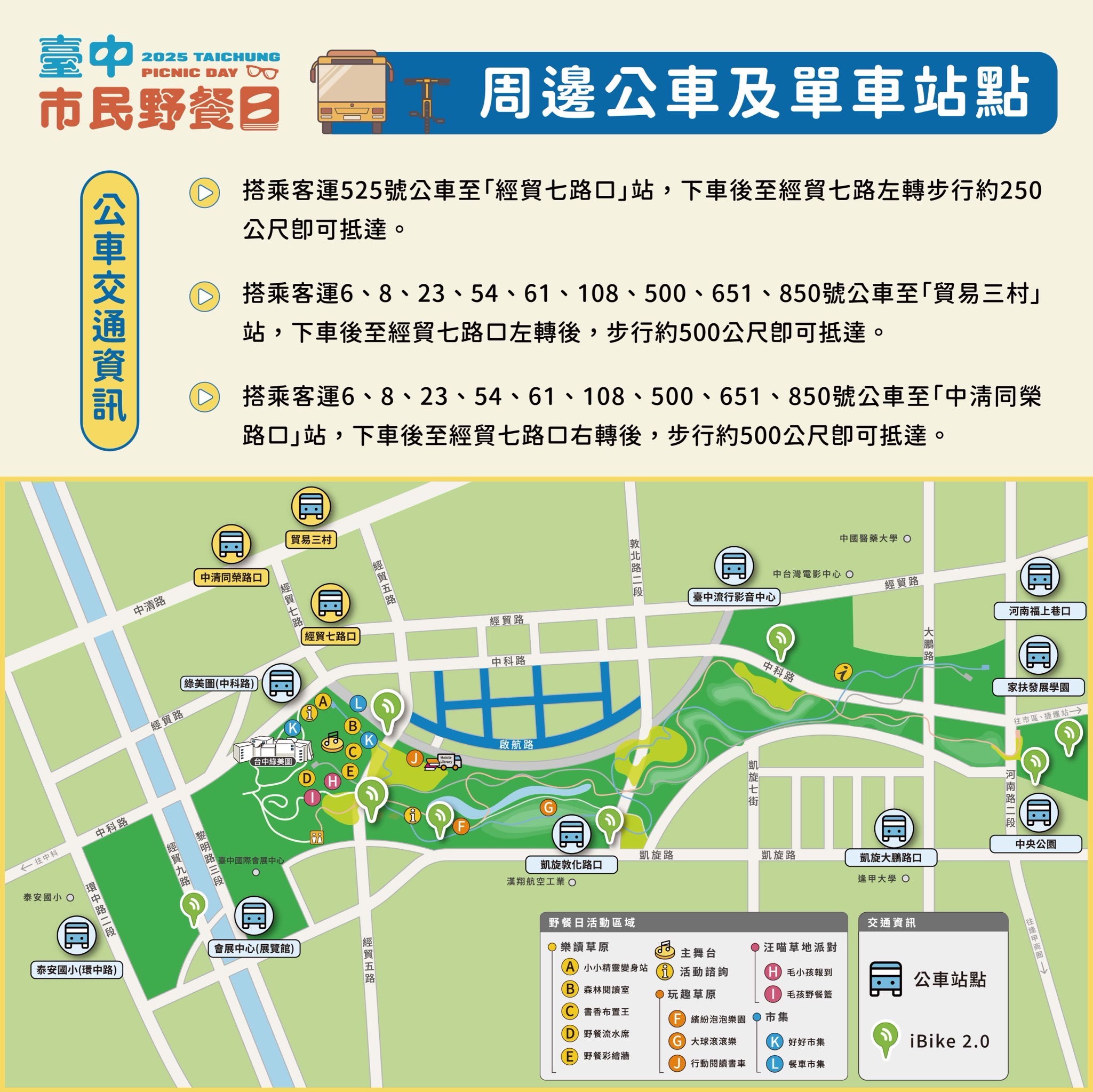 「2025台中市民野餐日」將在明(2)日登場!為方便民眾順利抵達活動現場,台中市政府建設局特別整理各項交通資訊懶人包,鼓勵民眾多加利用大眾運輸工具,如市區公車、U-BIKE自行車前往,不僅舒適免除尋找車位的困擾,也能落實環保、實踐低碳的綠色城市生活。