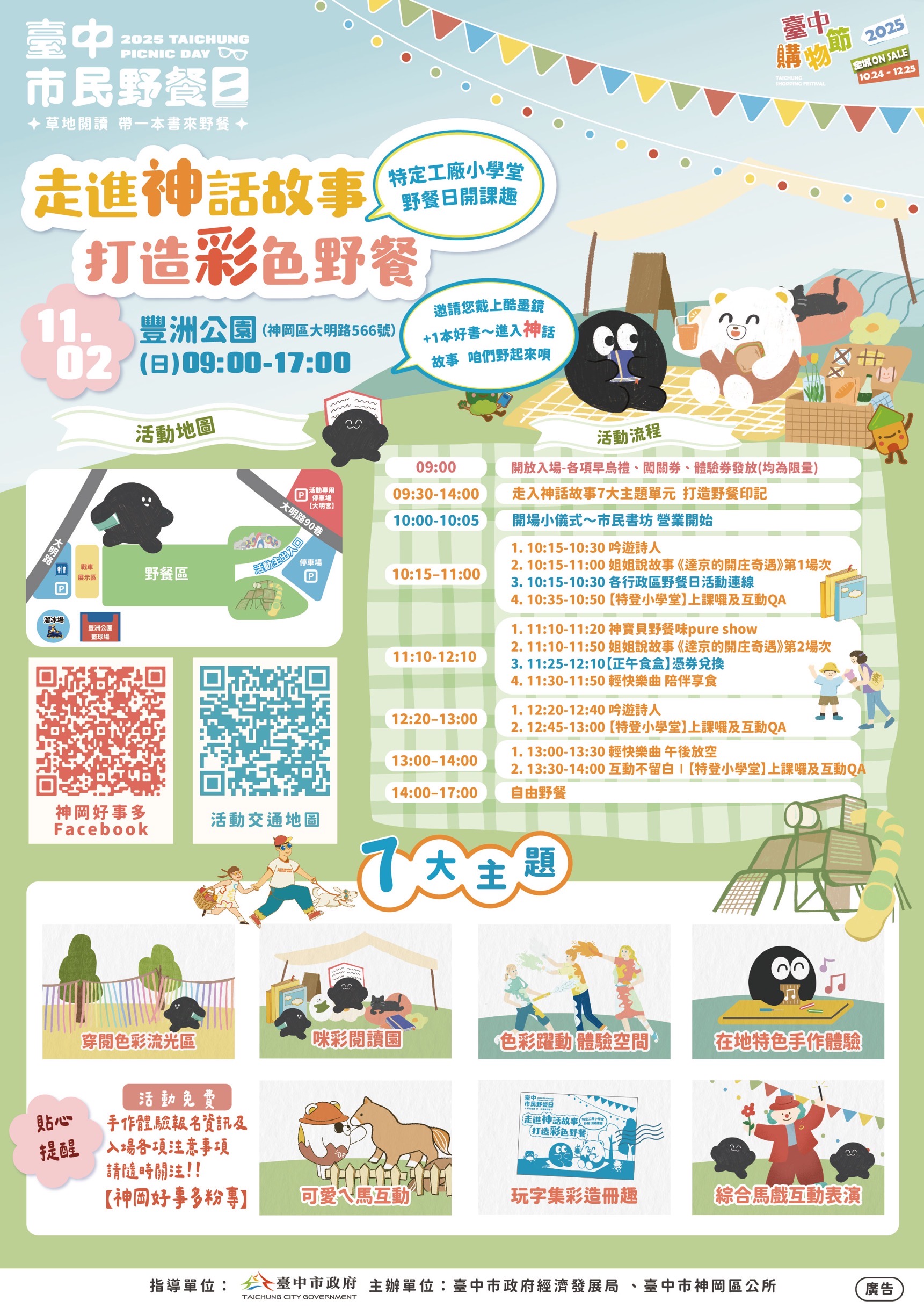 由台中市政府經濟發展局與神岡區公所攜手,2025台中市民野餐日將於明(2)日在神岡豐洲公園熱鬧登場,活動以「草地閱讀趣・一起野餐去」為主題,以「特登小學堂」結合「走進神話故事・打造彩色野餐」的概念舉辦野餐日活動,邀請市民朋友戴上墨鏡、穿著白色T恤、牛仔褲,帶上一本喜愛的書、野餐墊、自己喜歡的甜點輕食到神岡,在從早晨到中午的悠閒時光,走進公園、閱讀好書,一邊享受豐洲公園自然風光,一邊在悠揚樂音伴隨下享用美味小點,體驗野餐輕鬆活力氛圍。