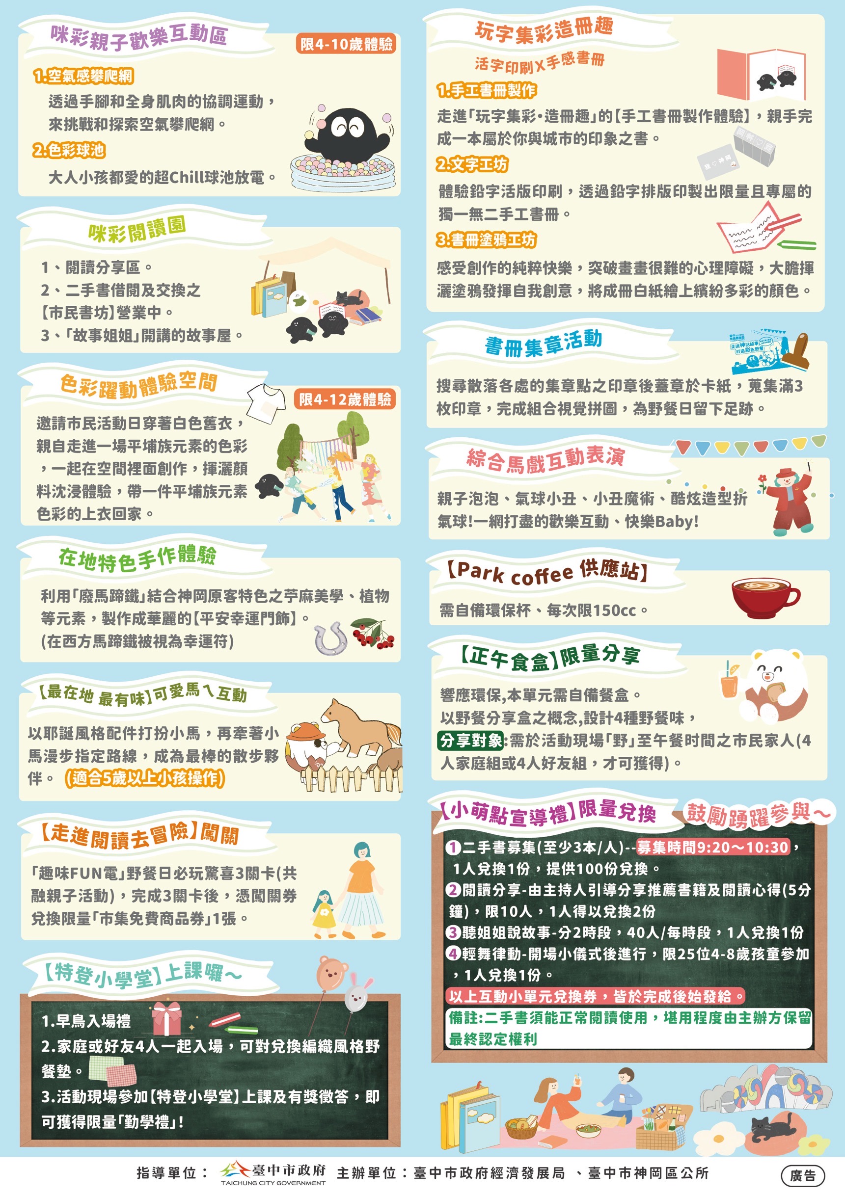此外也推出「在地特色手作體驗」,以馬蹄鐵與苧麻打造「平安幸運門飾」;可愛的迷你馬與民眾互動拍照,成為最受歡迎的打卡亮點;「玩字集彩造冊趣」讓小朋友體驗活字印刷裝幀小書,培養創作樂趣;「特登小學堂」透過趣味互動問答,例如介紹位在神岡區的「豐洲科技工業園區」產業特色及進入工廠的小知識等,將產業發展教育向下扎根。草地上更有泡泡秀、小丑魔術表演與音樂律動,為秋日午後添上熱鬧氛圍。