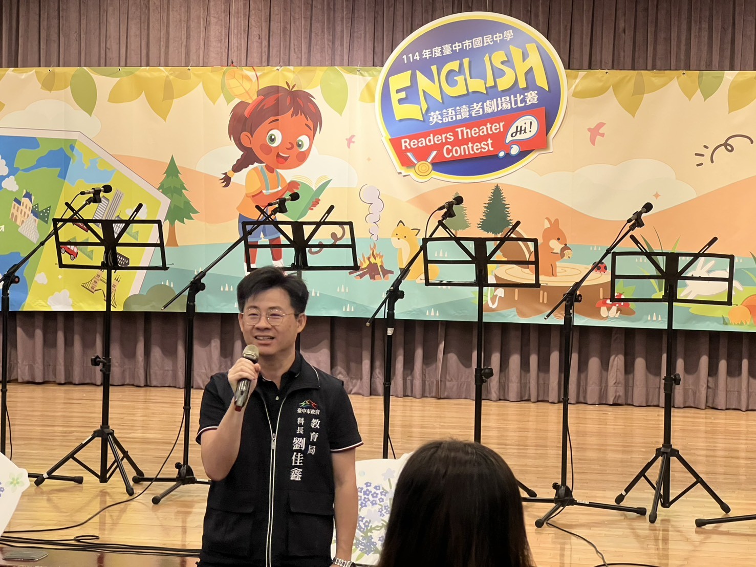為推動英語學習生活化、展現雙語教育成果,台中市政府教育局昨(4)日、今(5)日在大墩文化中心舉辦國中學生英語讀者劇場比賽,共有44所國中、約500位學生齊聚登場,以流利的英語口說、豐富的語調與創意音效詮釋故事,讓觀眾沉浸於聽覺的想像之中。