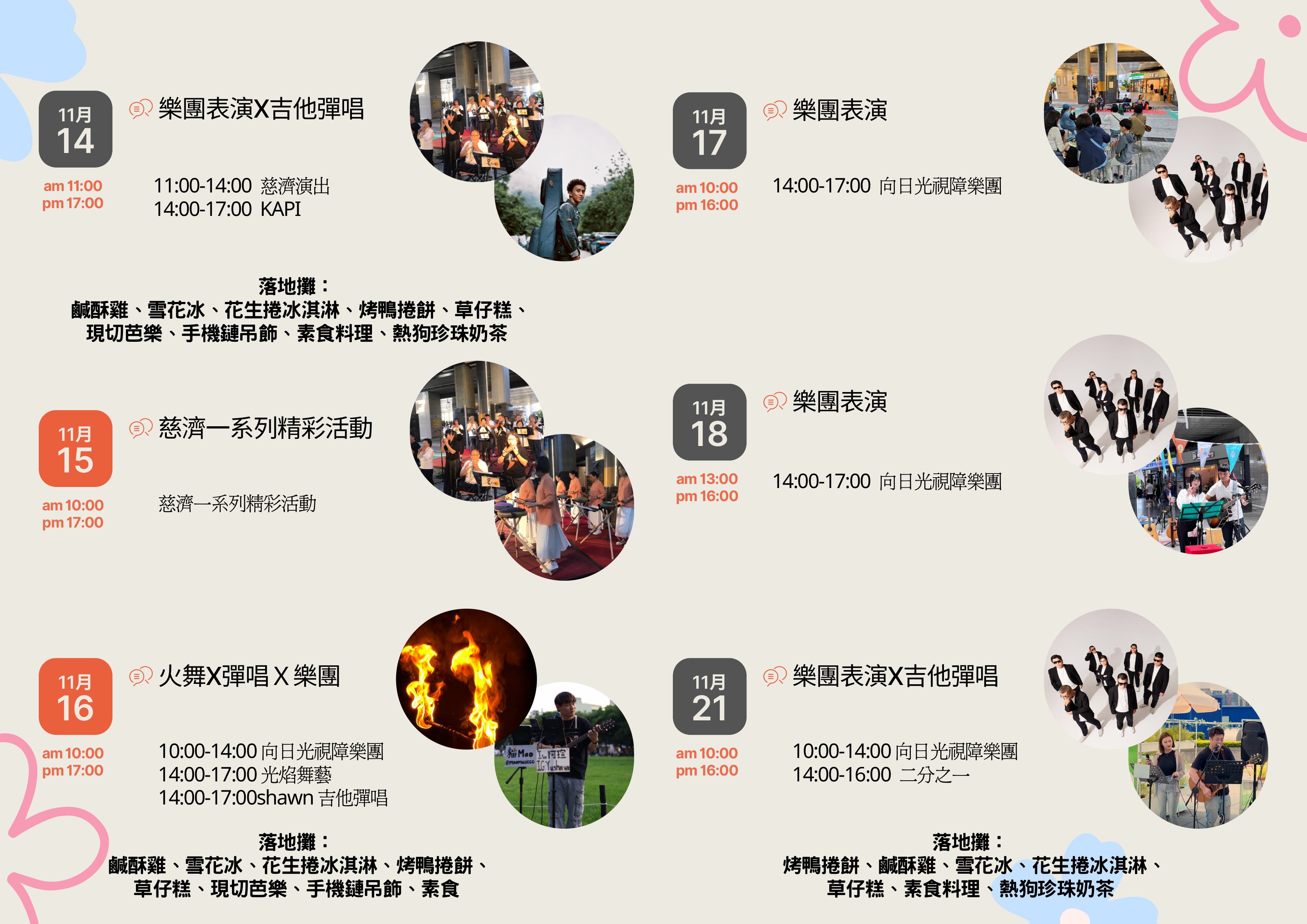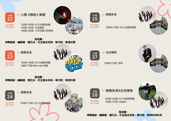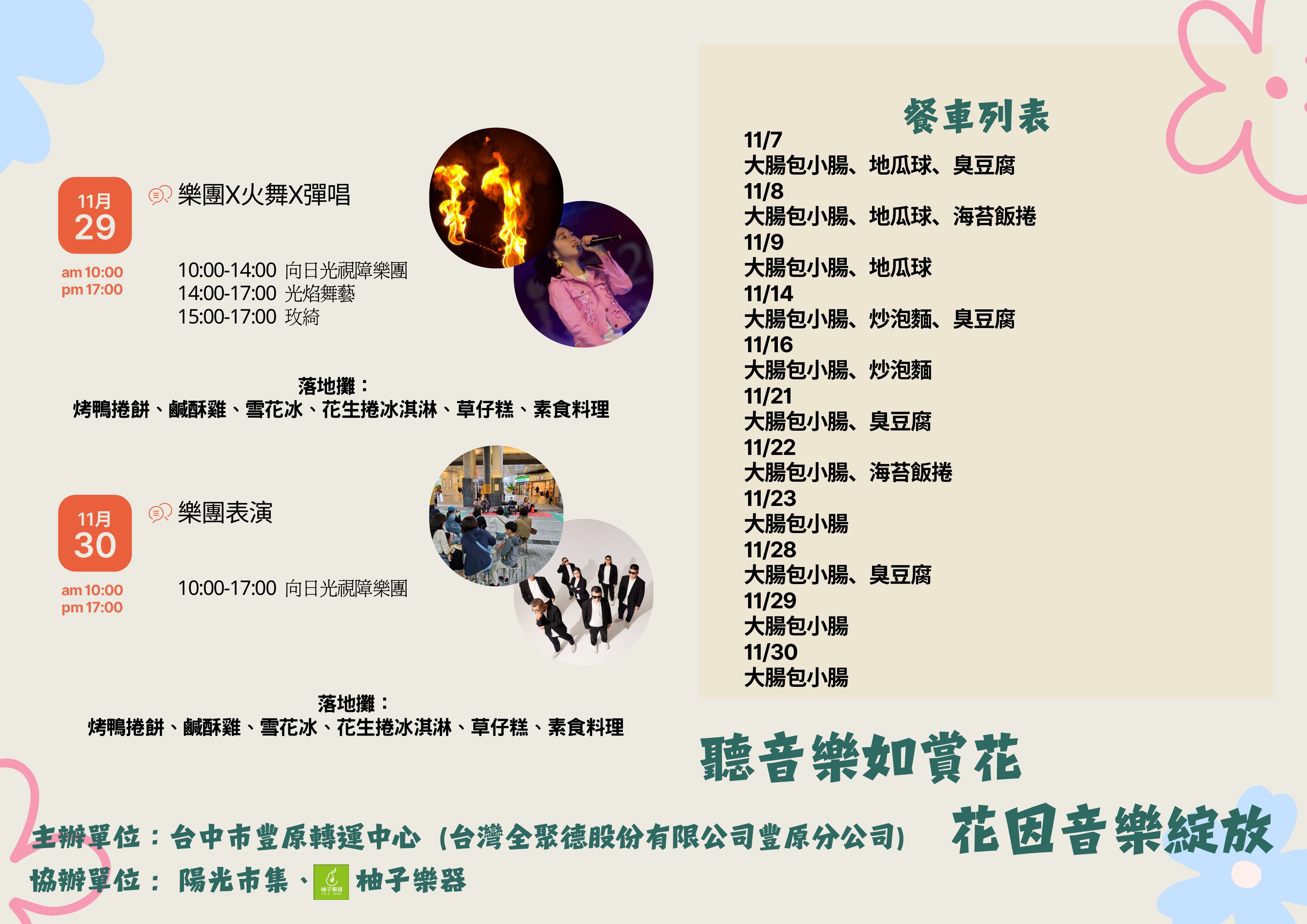 交通局說明,活動期間豐原轉運中心化身歡樂嘉年華,將於11月8日至11日、11月14日至18日、11月21日至25日、11月28日至30日,連續四週安排多組藝文團體接力演出,包括樂團表演、吉他彈唱、中國笛演奏及向日光視障樂團等,讓等車旅客也能享受音樂與藝術氛圍。現場同時設有主題餐車市集,集結多款在地美食與特色小吃,讓賞花旅程更添風味。