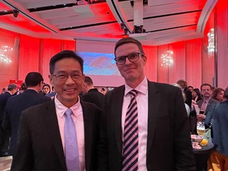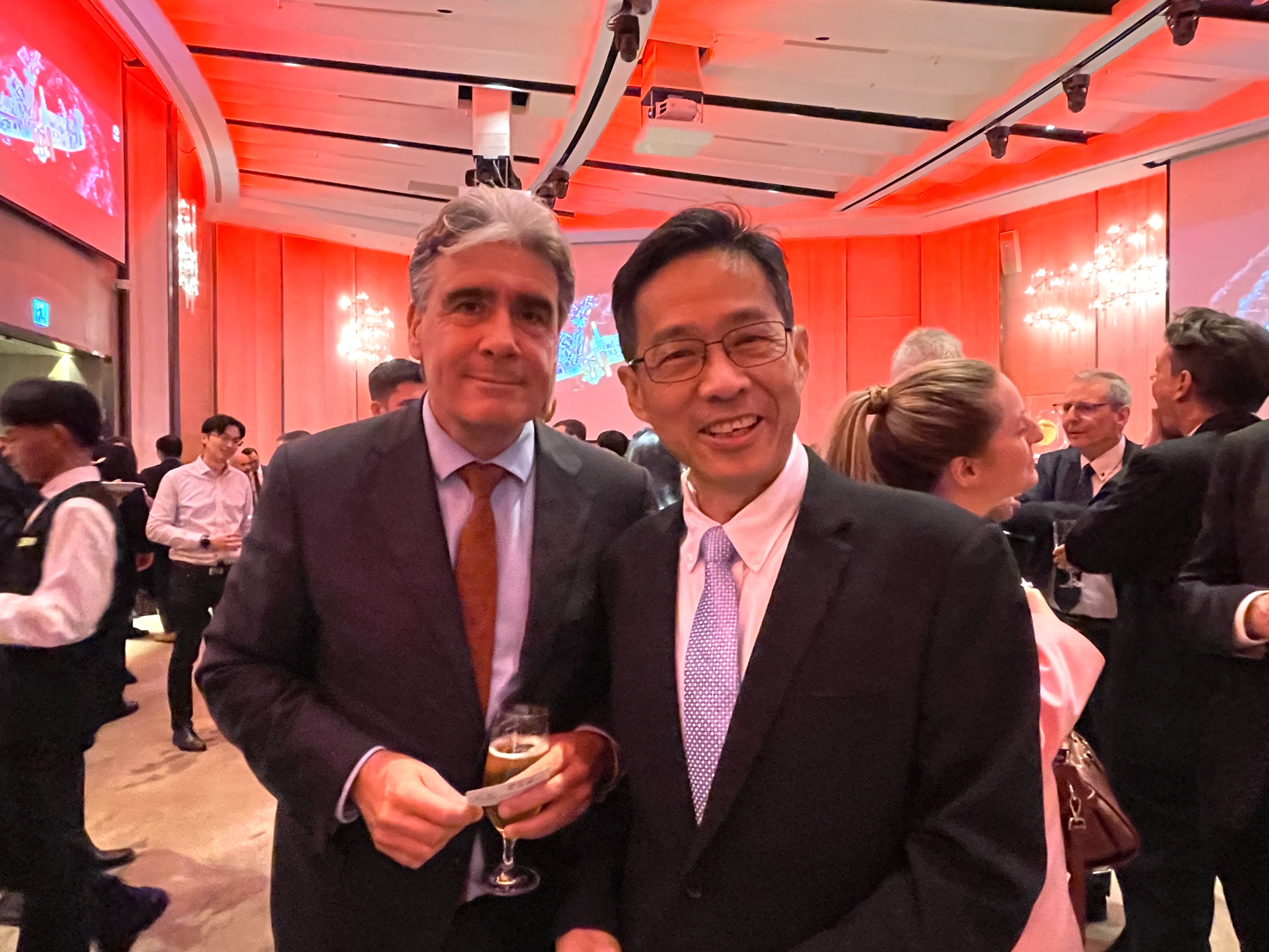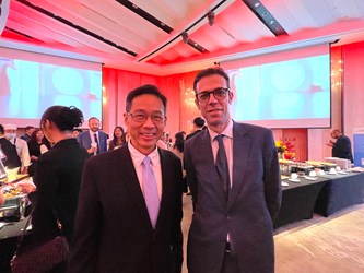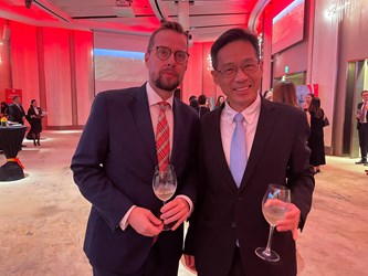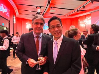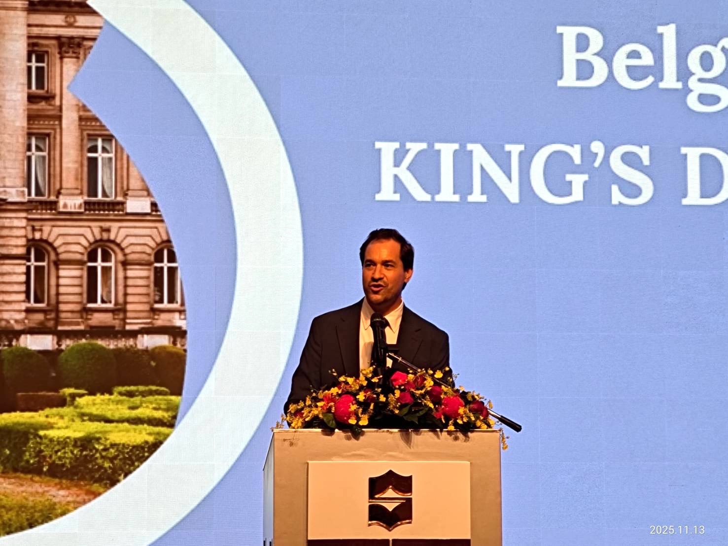 比利時為紀念1830年建國及彰顯國王榮耀,每年11月15日歡慶國王節,比利時台北辦事處今(13)日於台北遠東飯店舉辦慶祝活動,台中市政府經發局長張峯源應邀代表市長盧秀燕出席致賀,與去年代言台中購物節的比利時台北辦事處馬徹處長相見歡,互動相當熱絡。