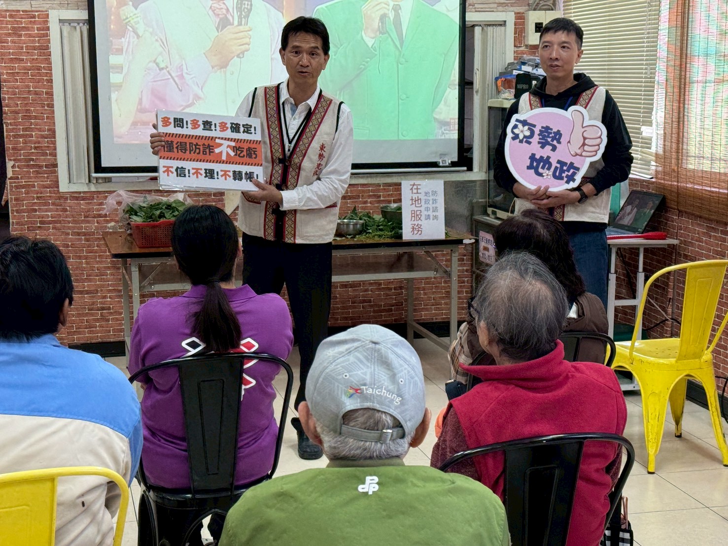 為落實「地政服務零距離」,東勢所將持續與各機關、區公所及里辦公處合作,深入部落與村里辦理防詐宣導與地政諮詢,將服務帶進社區,縮短城鄉差距,提升民眾對地政業務的信任與參與。(11/15*15)*地政局