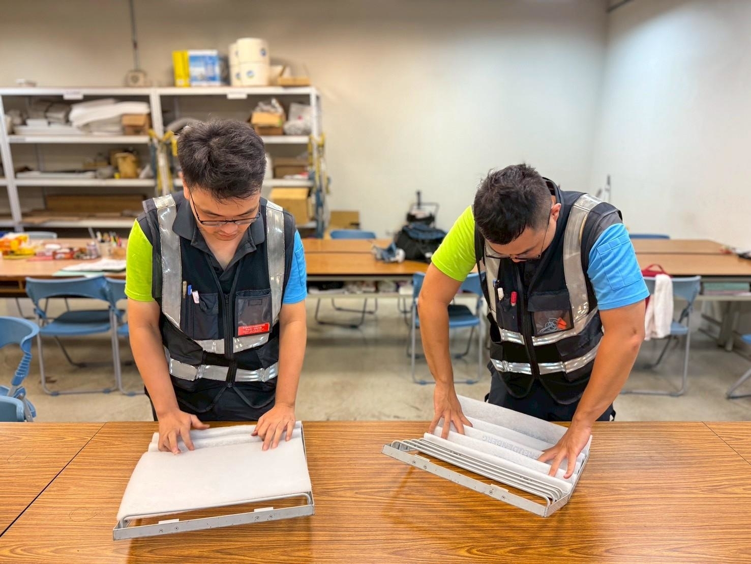 中捷公司說明,空調就像列車的「呼吸系統」,綠線電聯車使用的回風濾網可清洗、可重複使用,外型宛如摺扇。如此設計的用意是讓濾網更貼合框架,提升過濾效果,讓氣流風量更加穩定通暢。回風濾網在拆卸與清洗後,維修人員必須將濾網「對摺再對摺」裝回框內,確保緊密服貼、氣流順暢,讓車廂空氣品質維持最佳狀態。