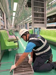 台中捷運綠線運量穩定成長,為維持車廂內空氣清新與乘車舒適度,中捷公司每月定期進行電聯車空調系統清潔作業。其中,特殊設計的回風濾網清洗後必須由維修人員手工「對摺再對摺」,才能重新安裝。維修人員笑說,歌曲「對摺」有句歌詞「對摺再對摺,輕輕把夢也對摺」,而他們是把對旅客的心意摺進每一片濾網裡。