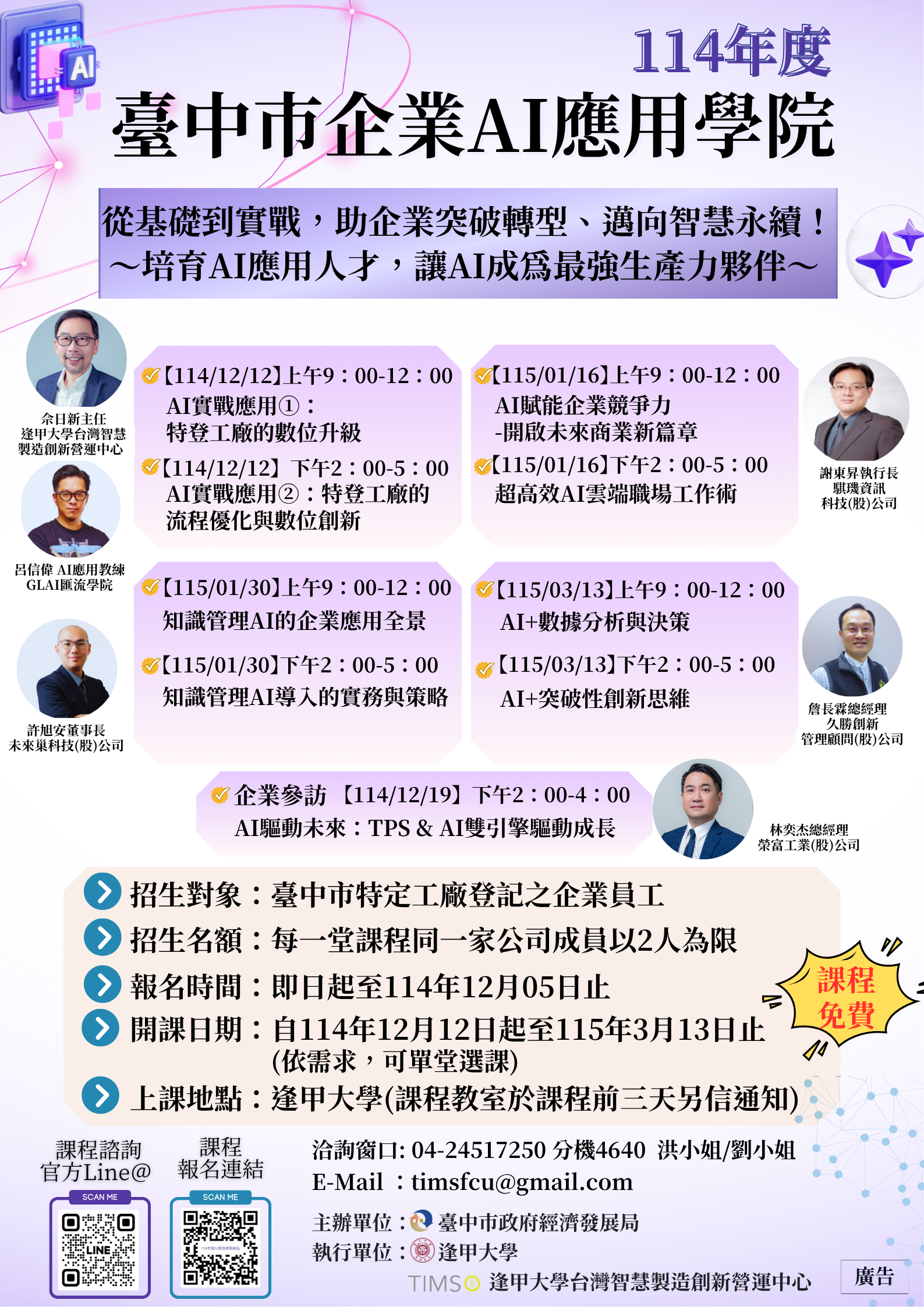 面對國際局勢變動與產業轉型壓力,AI已成為企業提升競爭力的關鍵工具。台中市政府經濟發展局再度攜手逢甲大學啟動「114年度台中市企業AI應用學院」招生,今年特別強調「AI實作落地」,邀請台中市特定工廠把實際生產問題帶進課堂,由業界專家具產業經驗的專業講師現場指導,協助企業把AI真正用在每天的工作中,提升效率、降低成本、強化產能。課程全程免費,即日起至12月5日受理報名,名額有限,歡迎台中市特登工廠踴躍參加!