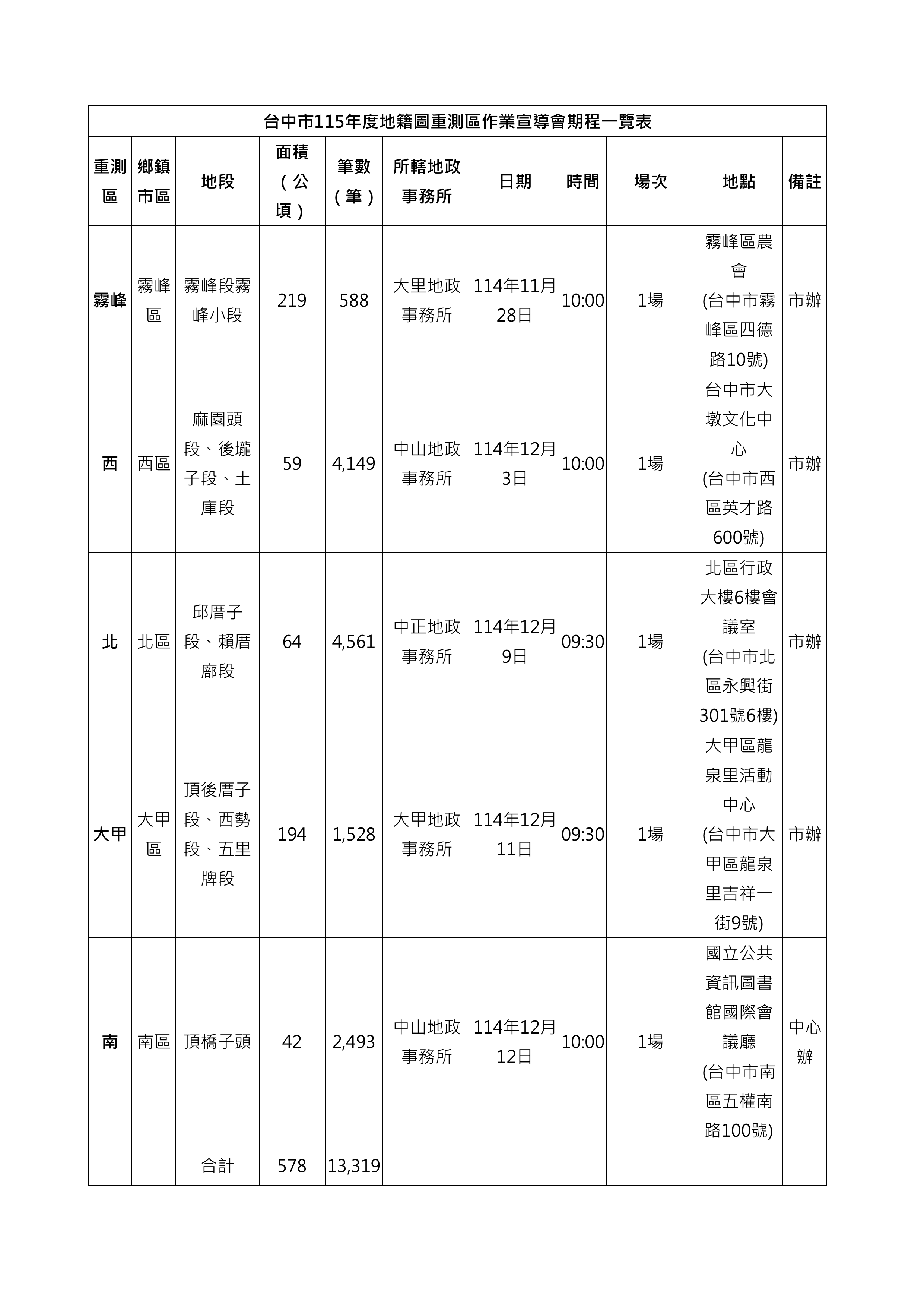 台中市115年度地籍圖重測作業展辦在即,為使重測區內民眾更加瞭解重測法令及作業緣由、流程,還有需要相關民眾應配合事項,各重測區將於今年11月底陸續分區召開地籍圖重測作業宣導會。
