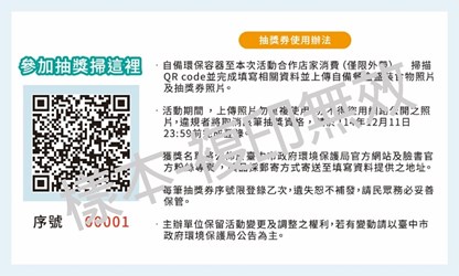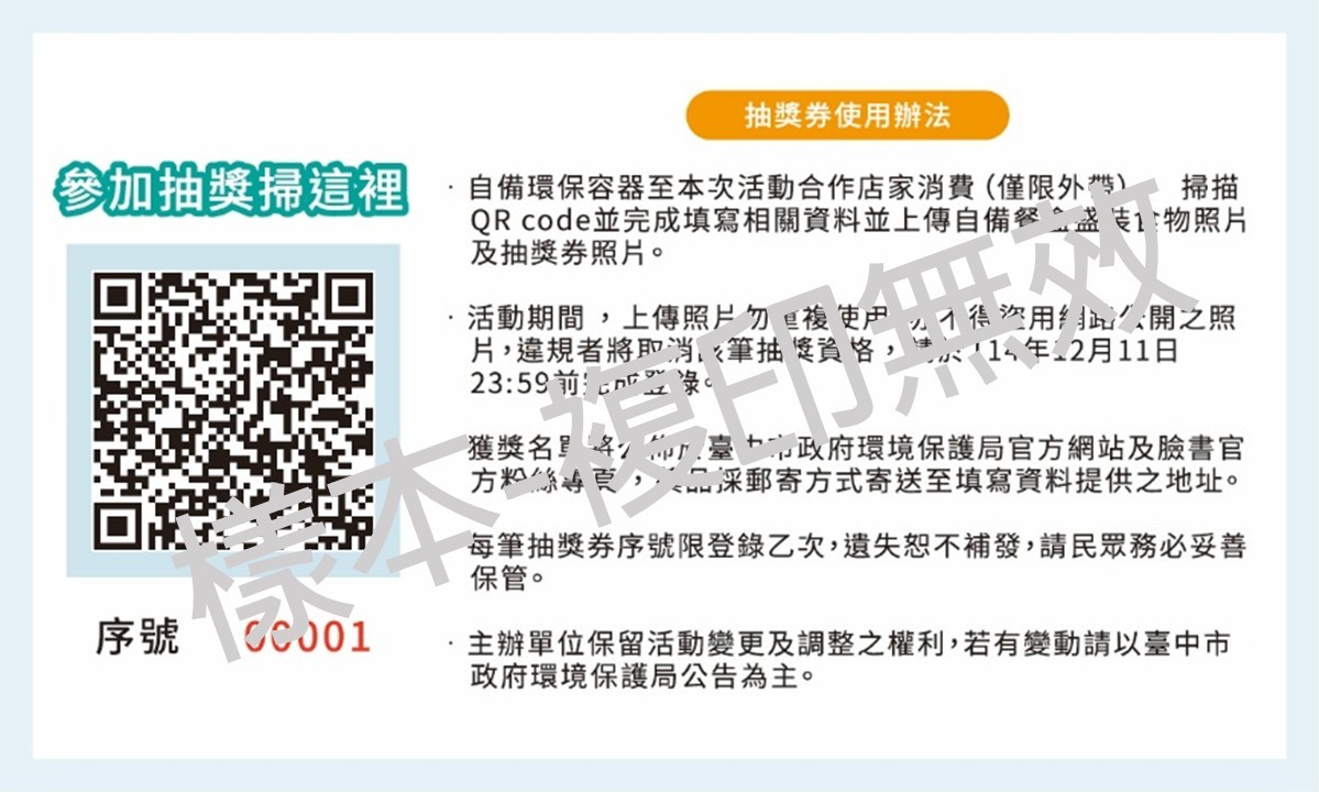 環保局表示,台灣外食文化盛行,外帶便利性提高生活效率,也增加免洗餐具垃圾量及環境負荷。為鼓勵民眾像源頭減量於日常用餐培養「自備、重複、少用」綠消費環保行動,期透過「自備誘因」鼓勵民眾自備習慣,逐步減少一次性用品的使用。此次活動結合餐飲業合作店家,民眾只要自備環保餐盒至合作店家消費外帶盛裝餐點,即可享有每份便當自備享折扣10元及贈送抽獎券1張(上述數量皆有限,送完為止),另部分店家自主提供自備優惠(如現金折扣、餐點加量或集點等多元優惠,依活動公告為準)。此外,於活動期間掃描抽獎券QR Code( https://reurl.cc/8b2qWM )並上傳自備容器盛裝食物照片、抽獎券照片及完成登錄,即有機會參加抽獎!