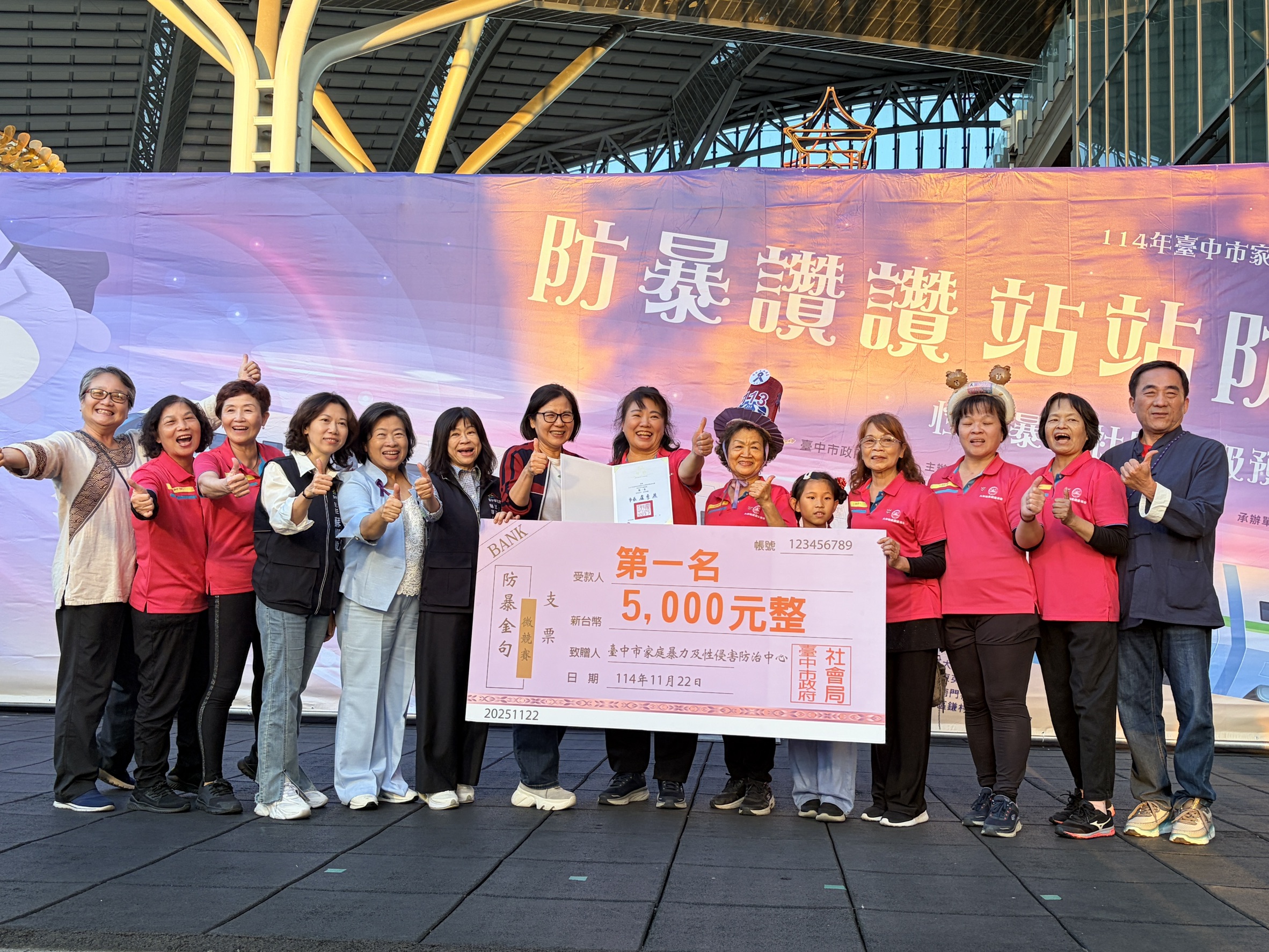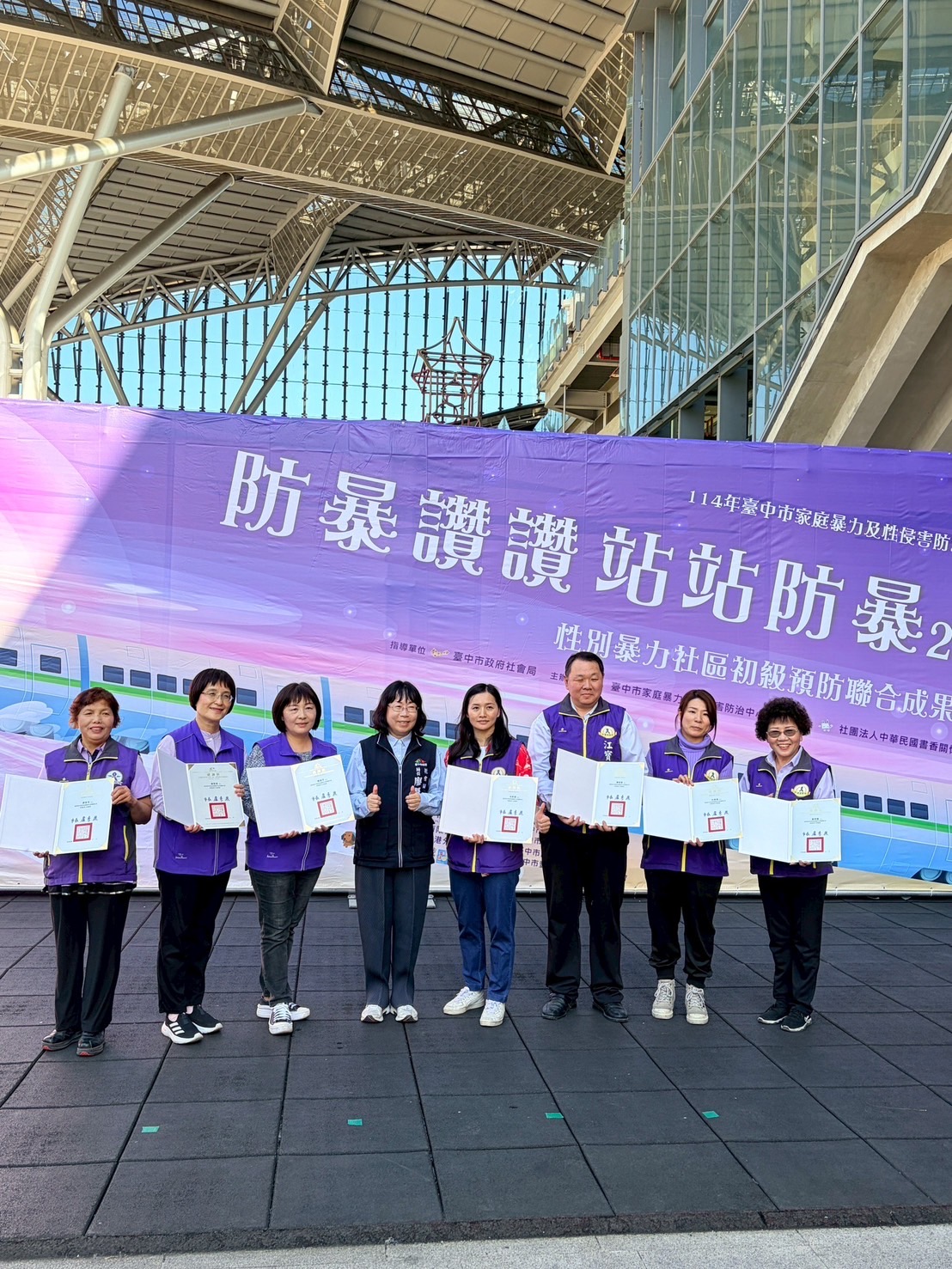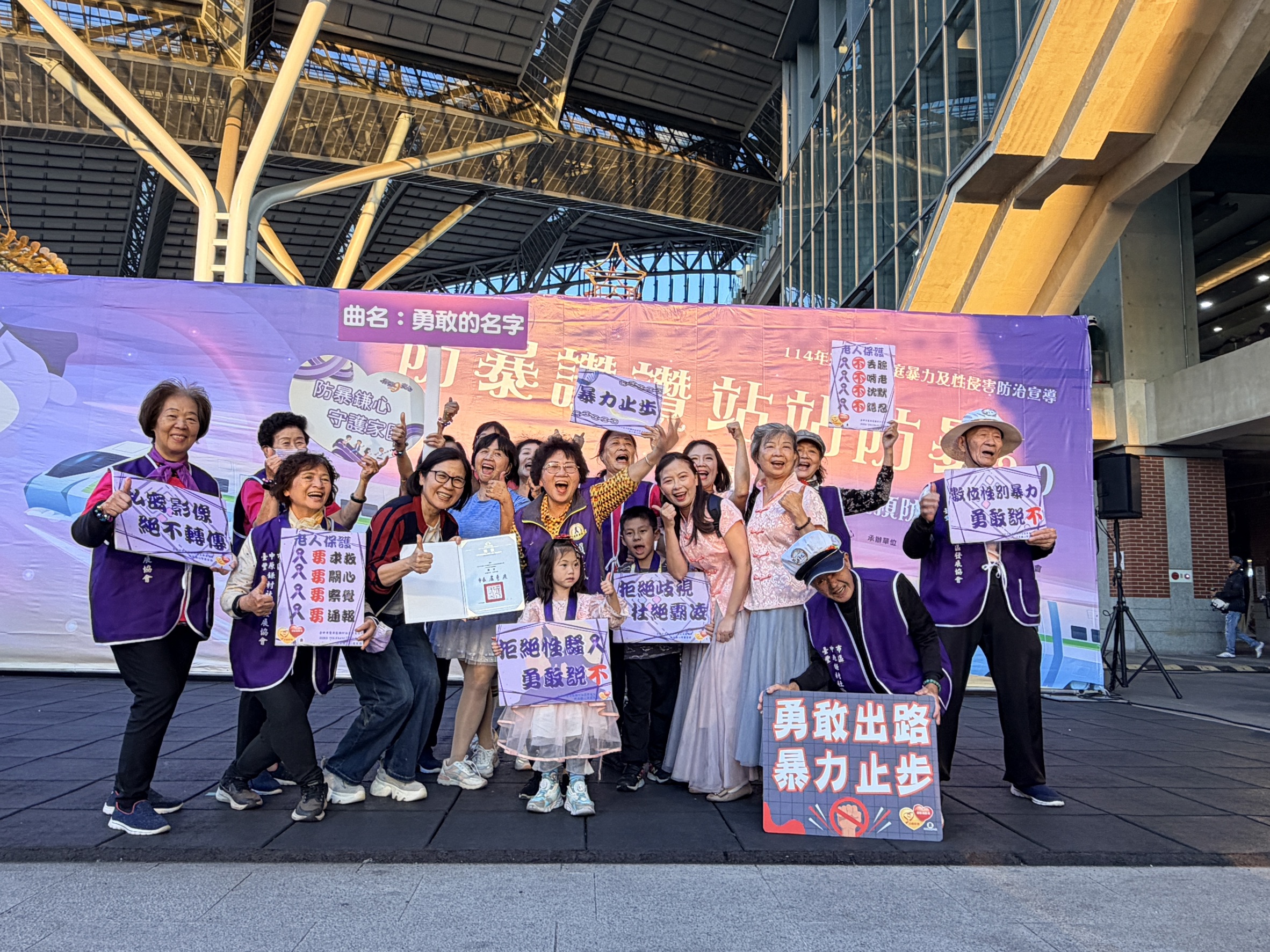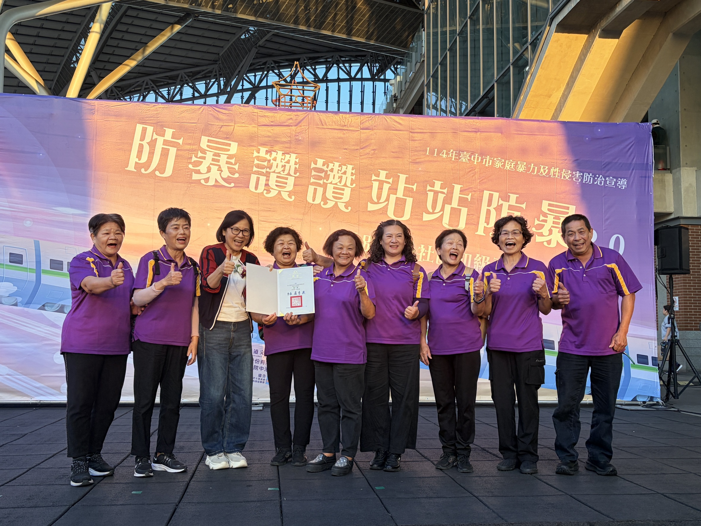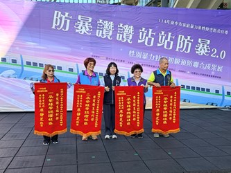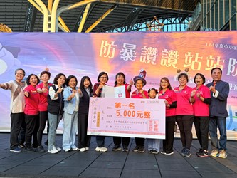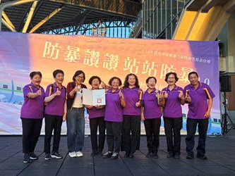 台中市家庭暴力及性侵害防治中心今(22)日在台中驛鐵道園區舉辦「防暴讚讚~站站防暴2.0」性別暴力社區初級預防聯合成果展,全國首創邀請社區站上防暴舞台,以表演搭配口號,傳達「防暴零容忍」;衛生福利部保護服務司司長張秀鴛擔任評審,選出最響亮的防暴金句,展現社區推動防暴的創意和決心。