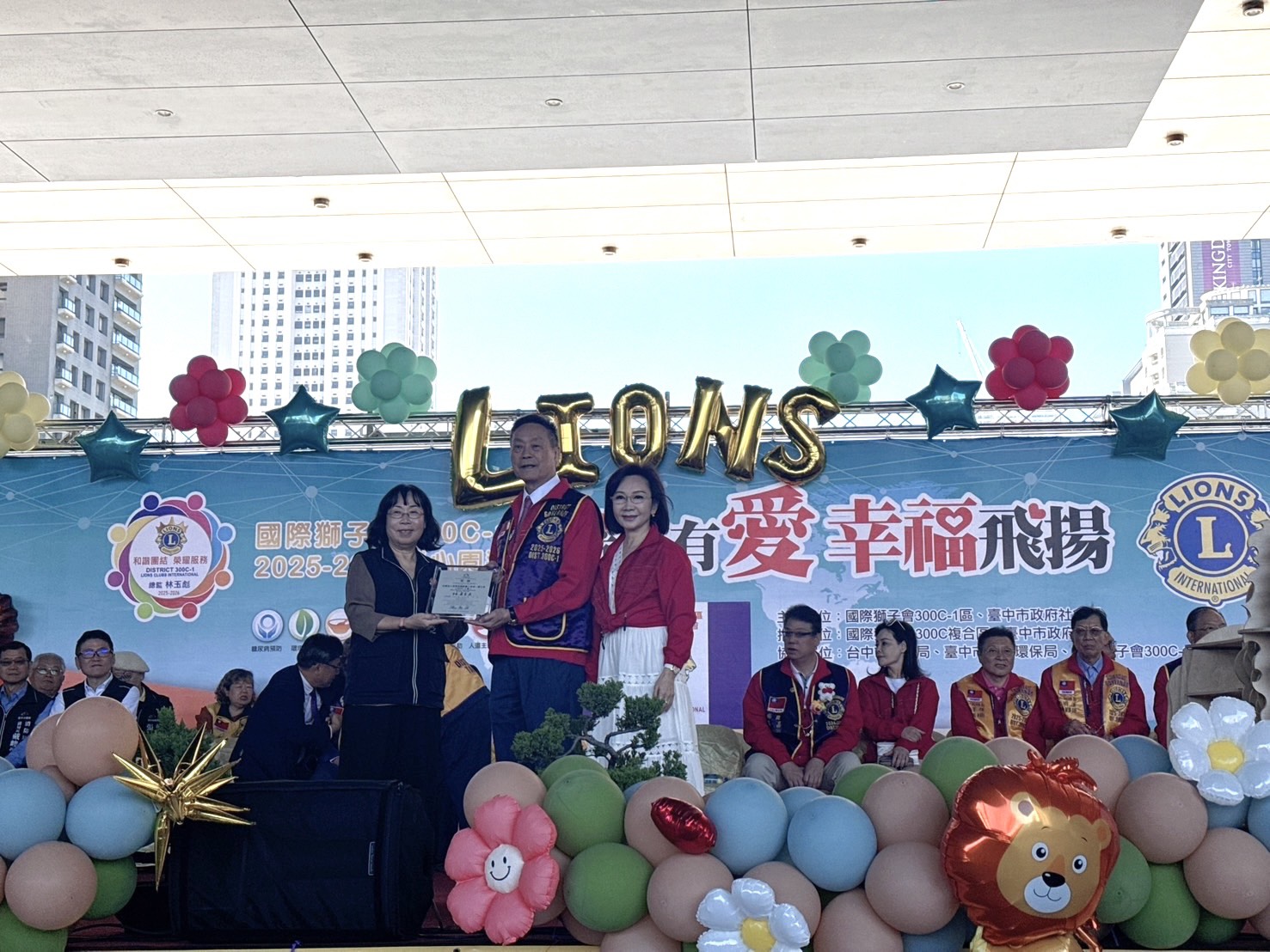 社團法人台灣省國際獅子會第二聯合會300C-1區今(23)日舉辦「希望有愛.幸福飛揚」愛心園遊會,此次活動籌募的愛心款項,將捐贈台中市政府復康巴士及消防警備車。市府社會局長廖靜芝和消防局副局長戴峻焜代表受贈,感謝民間力量公私協力、攜手公益,加倍台中市的社褔能量和救災能量。