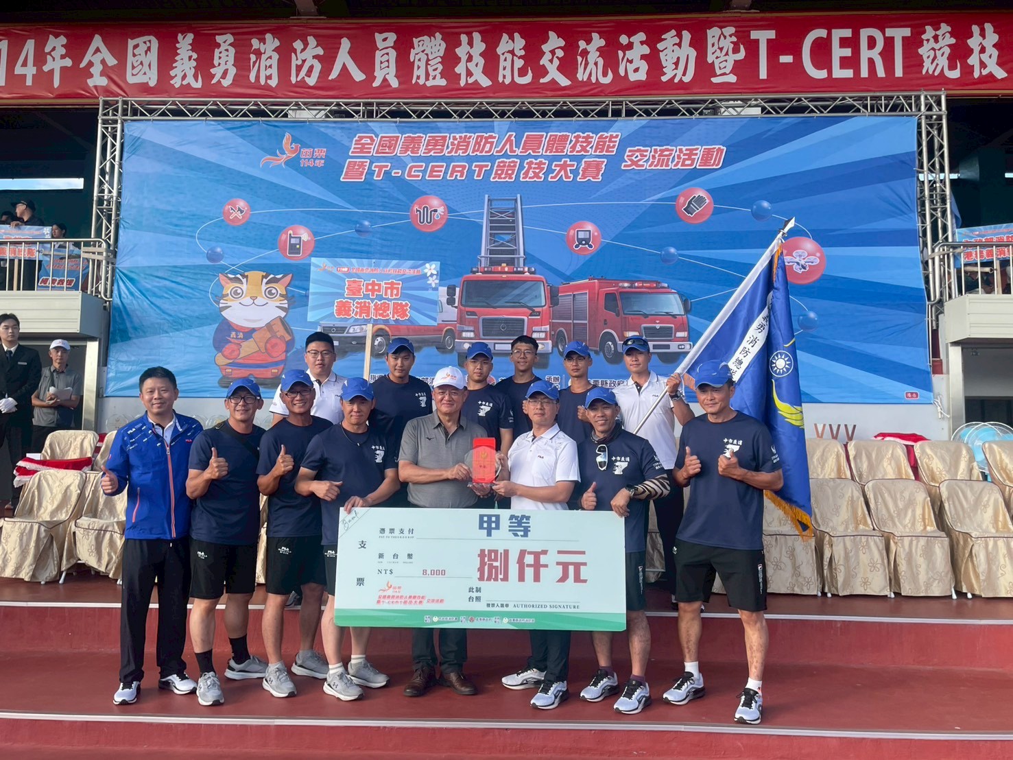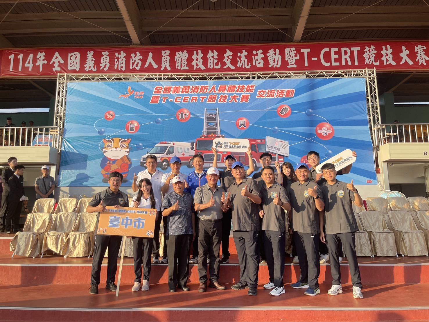 台中市政府消防局義勇消防人員、救護義消、機能義消及T-CERT(台灣民間自主緊急應變隊)隊伍,於「114年全國義勇消防人員體技能暨T-CERT競技大賽」中表現亮眼,從全國各地強隊中脫穎而出,展現台中市民力團隊扎實訓練成果及精湛救災專業。台中代表隊於多項賽事締造佳績,完整展現團隊合作默契與臨場反應能力,是中市T-CERT制度推動與民力培訓的最佳成果展現。