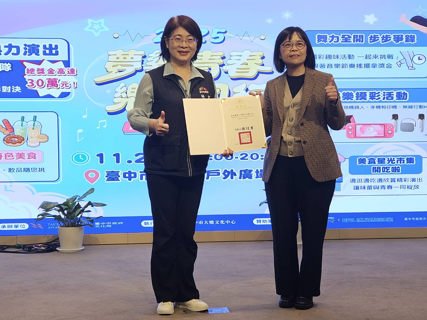 為營造更具吸引力的活動現場,文化局今年特別打造繽紛的青春派對。活動當天下午4點起設置美食星光市集,並於4點30分開始發放「青春食光同樂會」美食兌換券,數量有限、送完為止。現場還安排「舞力全開-步步爭鋒」趣味挑戰,邀請民眾跟著節奏搖擺角逐獎金;更有Switch Lite、掃地機器人、手機相印機等超值禮品的歡樂摸彩,好禮等大家帶回家。文化局邀請市民於11月29日一同前往中山堂,感受雙十強隊伍的高光時刻,用掌聲與熱情共同點亮城市青春。