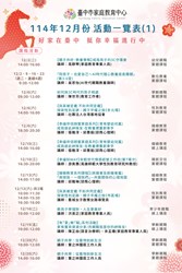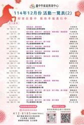 🍁臺中市家庭教育中心邀您一起參與本月精彩多元的課程活動~從親職教育婚姻經營、數位教養、青少年溝通、幼兒教養到性別教育及婚前交往準備等主題應有盡有,讓我們在溫馨互動的氛圍中學習,累積創造幸福、和諧家庭的力量!