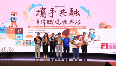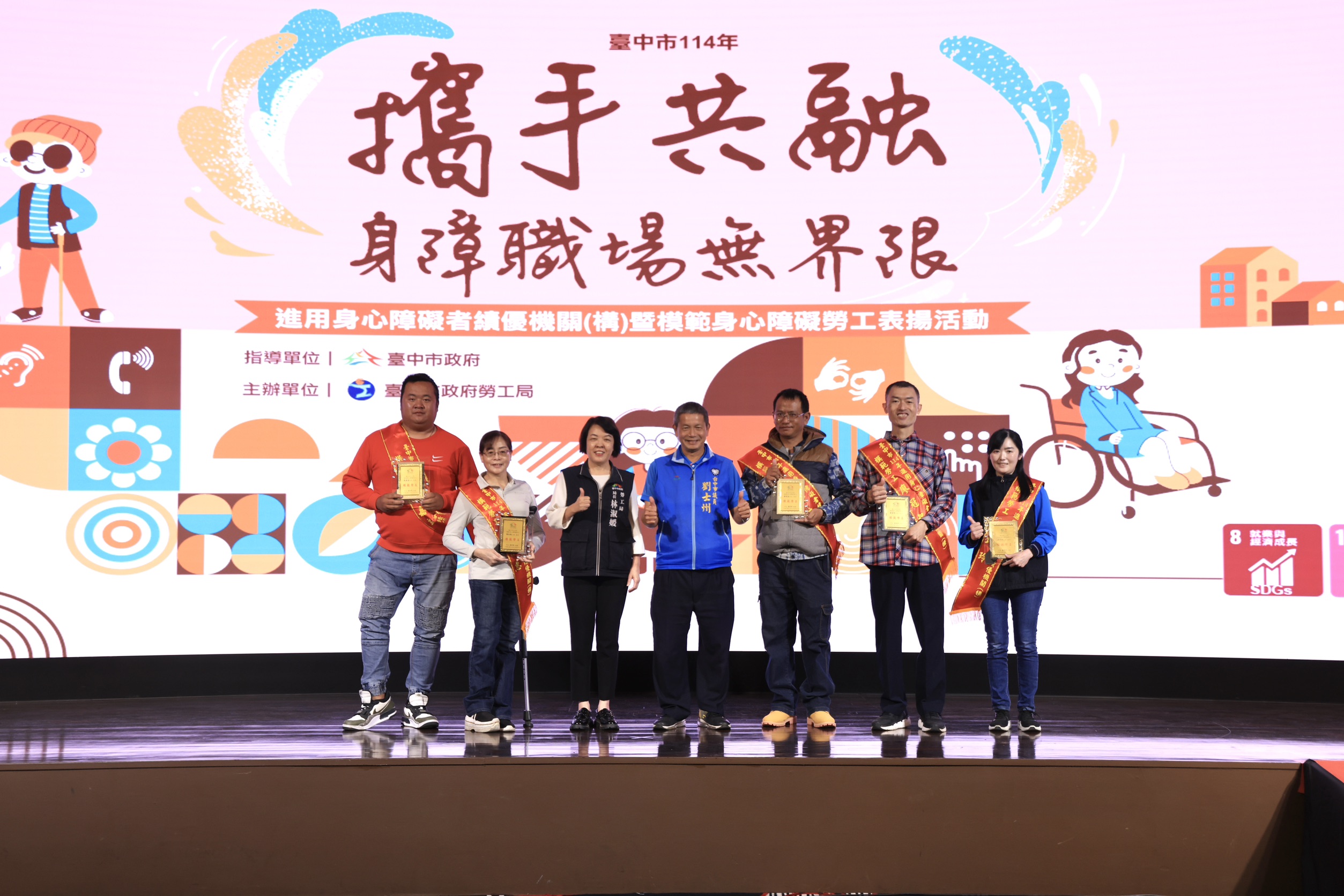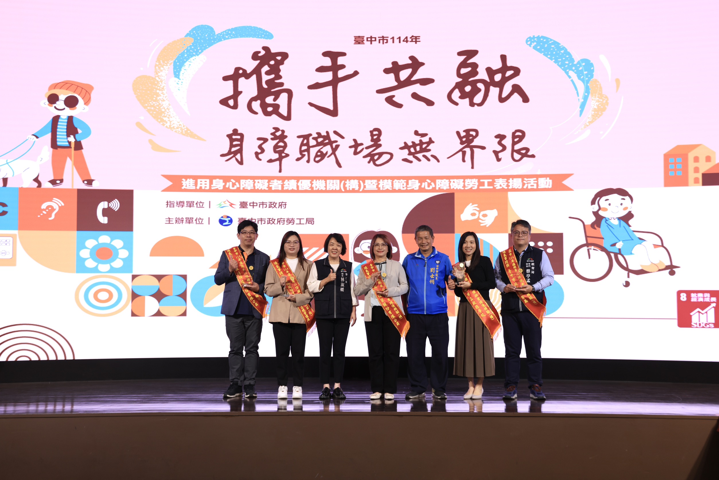 為鼓勵事業單位積極進用身心障礙者,並肯定身障朋友在職場上的堅持與貢獻,台中市政府勞工局於今(27)日舉辦「中市114年進用身心障礙者績優機關(構)暨模範身心障礙勞工表揚活動」,頒發包括楷模獎1名、優良事蹟獎10名、模範身心障礙勞工10名、公益採購獎10名,以及職場體驗友善廠商3名,共計34個單位及個人獲獎,場面溫馨感人。