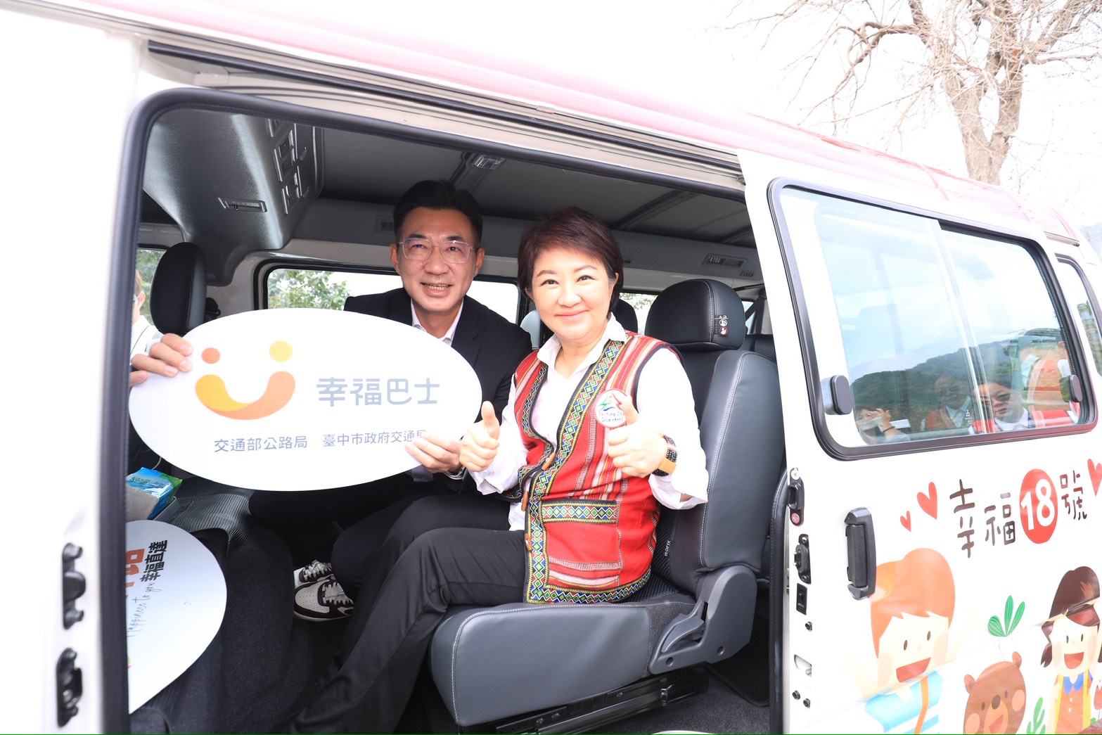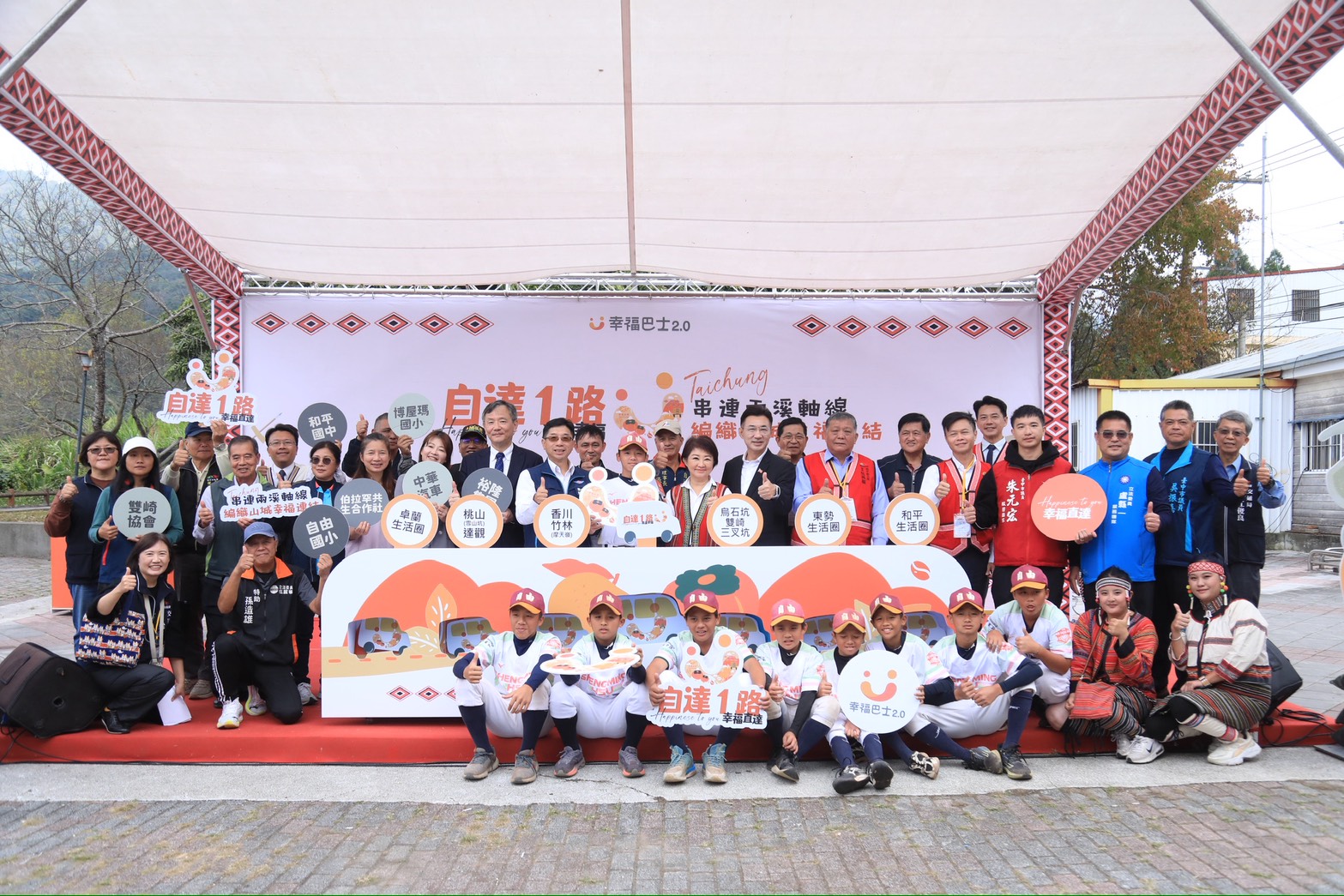 幸福巴士來了!台中市長盧秀燕今(28)日在雙崎921紀念公園宣布,自達幸福巴士正式上路。路線串聯東勢及卓蘭等鄰近生活圈,服務偏鄉、整合就學、長照等交通需求,並提供自由國小棒球隊訓練比賽最強交通支援,讓海拔1,000公尺的達觀里及自由里,享受「坐得安心,搭得便利」的公共運輸服務。 盧市長表示,因和平區幅員大、部落分散且交通不便,市府推動預約式接送服務,協助居民就醫與日常往返,此次新路線是中央、地方與民間合作成果,將持續完善偏鄉交通。