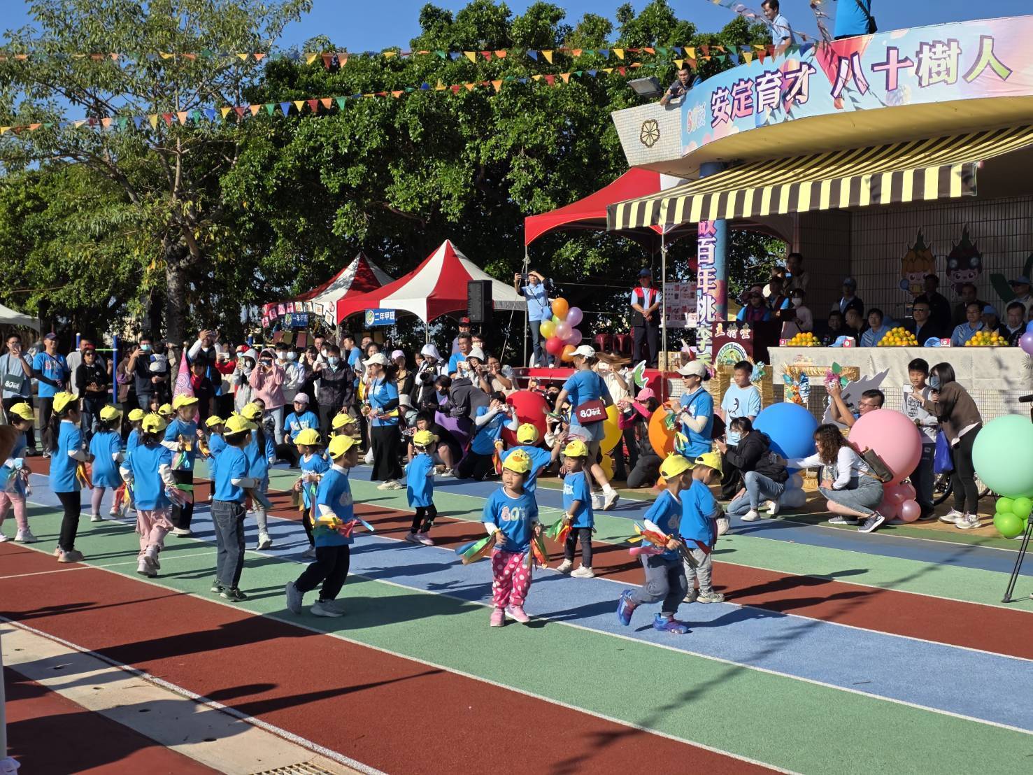 台中市外埔區安定國小創校80週年校慶今(6)日熱鬧登場,教育局副局長郭明洲到場祝賀,與全校師生共切幼兒園精心準備的生日蛋糕,歡慶80週年校慶。