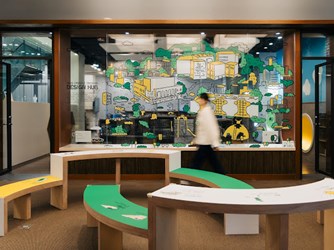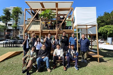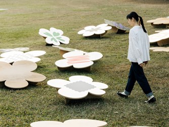 文化局說明,設計師Mike He以金屬花形戶外座椅呼應台中成長記憶,呈現他心中的「大晴天」;「伊德設計」涂以仁和「與木製研」陳建同共同創作的大型互動裝置,以木構、植物與光影為主要語彙,讓民眾在此自然放慢步伐,增進彼此交流,將黎明新村的日常轉化為各種相遇場景。插畫家阿蕉打造年度 IP「摺摺 Foldy」,象徵城市的變化與可塑性。部分衛星展區以即時影像連線促成不同展區觀眾的互動,創造新的相遇方式。