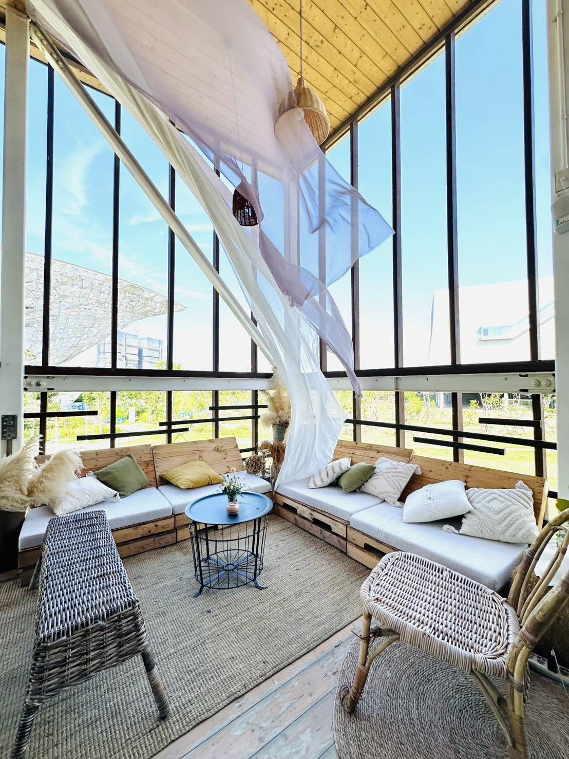 陳局長指出,試營運期間最受網美歡迎的是半戶外波希米亞風休憩區,布幔、地毯、棧板桌、抱枕與植栽交織出夢幻氛圍,挑高空間與自然光線讓隨手拍都像旅拍大片。場域亦貼心設置兒童遊戲區,親子同行也能輕鬆享受療癒時光,是假日出遊的理想選擇。