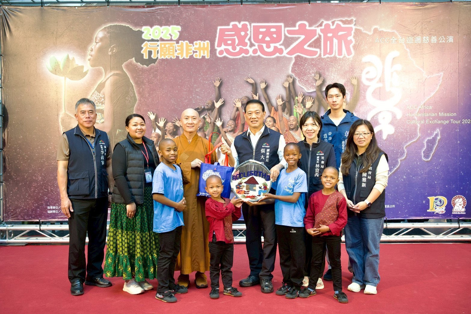 在非洲救助逾2萬名孩童的阿彌陀佛關懷中心(Amitofo Care Centre,ACC)將於明年1月2日,在台中中山堂推出「行願非洲.感恩之旅」慈善巡演。今(10)日於市府舉辦宣傳記者會,來自賴索托的26名院童以歌舞、鼓樂與燦爛笑容揭開序幕,純真而深刻的能量打動在場所有人,副秘書長張大春與貴賓們齊為孩子們的精彩演出熱烈鼓掌,並預祝巡演圓滿成功。