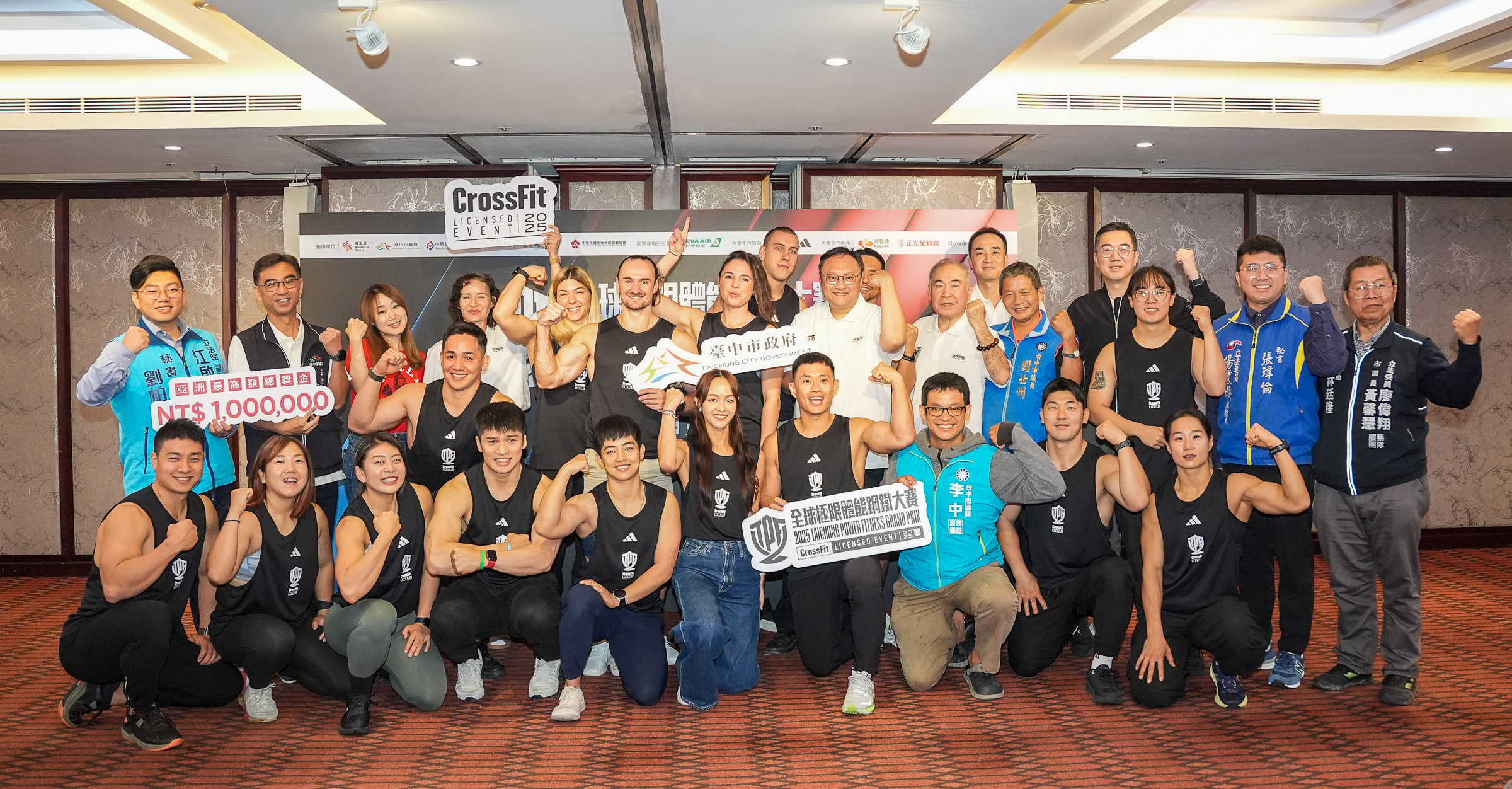 今日記者會,台中市副市長鄭照新、運動局長游志祥、市議員劉士州、中華民國文化休閒運動協會名譽理事長秦熙嶽、長榮航空客運營業本部副總經理王振興、台灣阿迪達斯股份有限公司運動行銷經理何旭平、Cross Fit總部東南亞區經理Julia Maree、台灣菁英選手洪寀睿及林力瑋、World Gym 品牌公關部經理廖容瑩、HYROX台灣官方大使廖嘉勒及劉芳芸以及世界菁英選手日本、韓國、俄羅斯代表隊們均出席;立法院副院長江啟臣、立委楊瓊瓔、廖偉翔、市議員黃馨慧、李中也派代表出席。