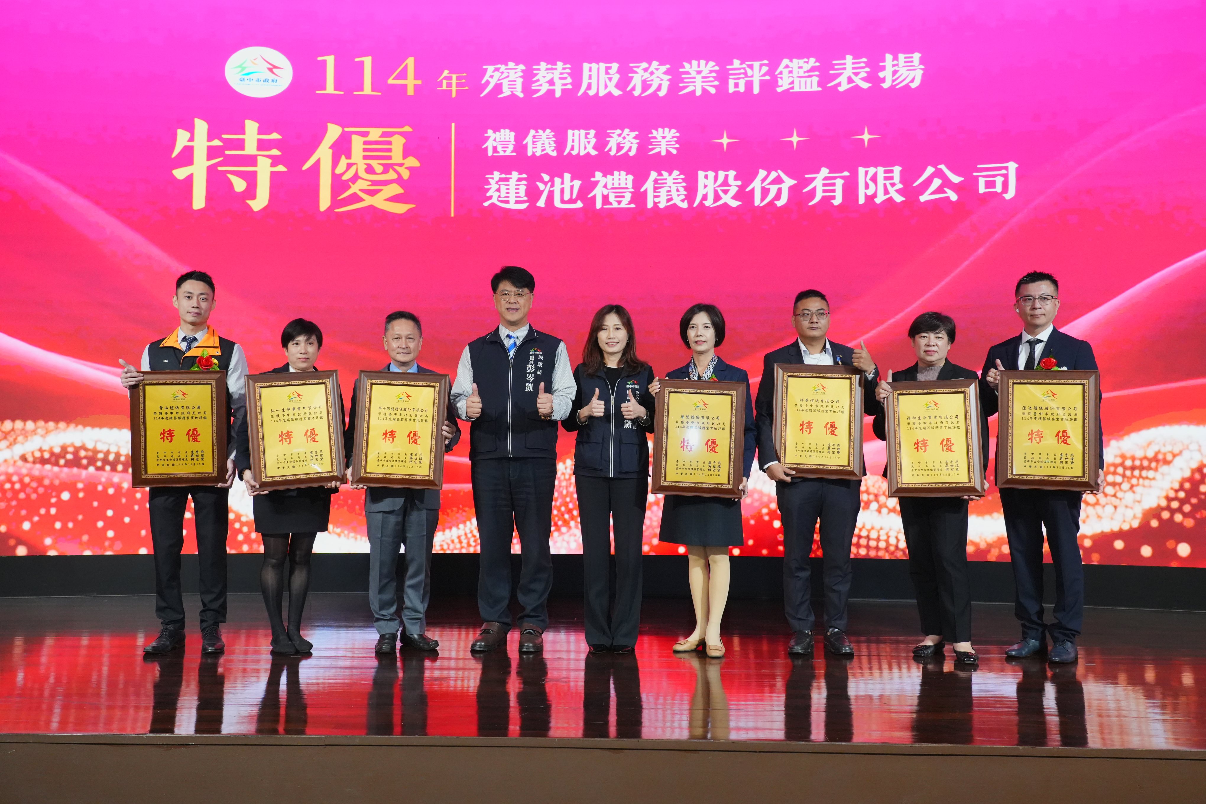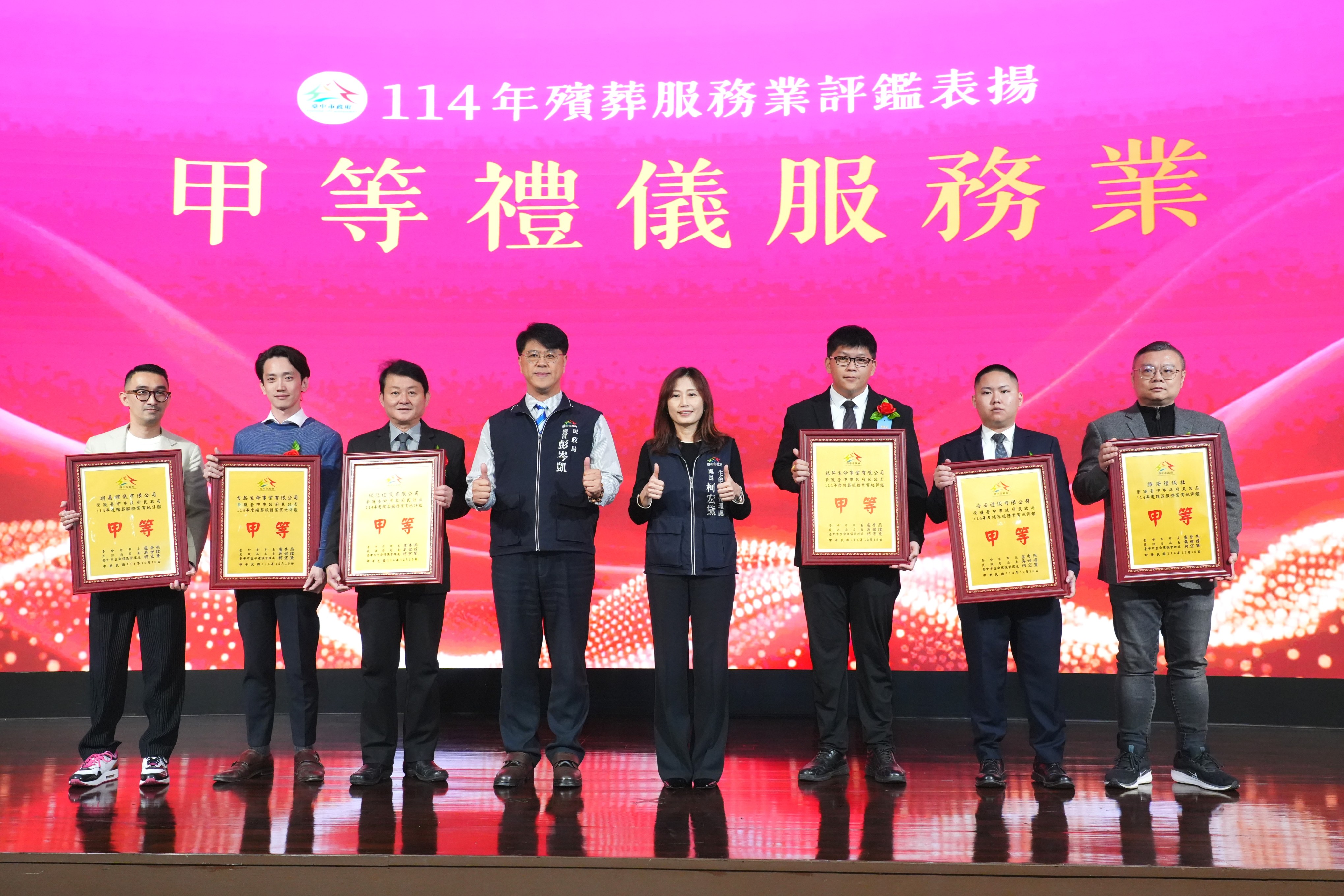 生管處補充,今年共120家禮儀服務業及9家私立殯葬設施參與評鑑,經評鑑小組綜合評選結果有11家榮獲特優,分別為宇錡建設股份有限公司、佑宇興業有限公司、幸福生命企業有限公司、致知興業有限公司、弘一生命事業有限公司、青山禮儀有限公司、祥和生命事業有限公司、祥華禮儀有限公司、華梵禮儀有限公司、楊子佛教禮儀股份有限公司、蓮池禮儀股份有限公司;另福元儀典生命禮儀有限公司及德華齋有限公司則獲優等。