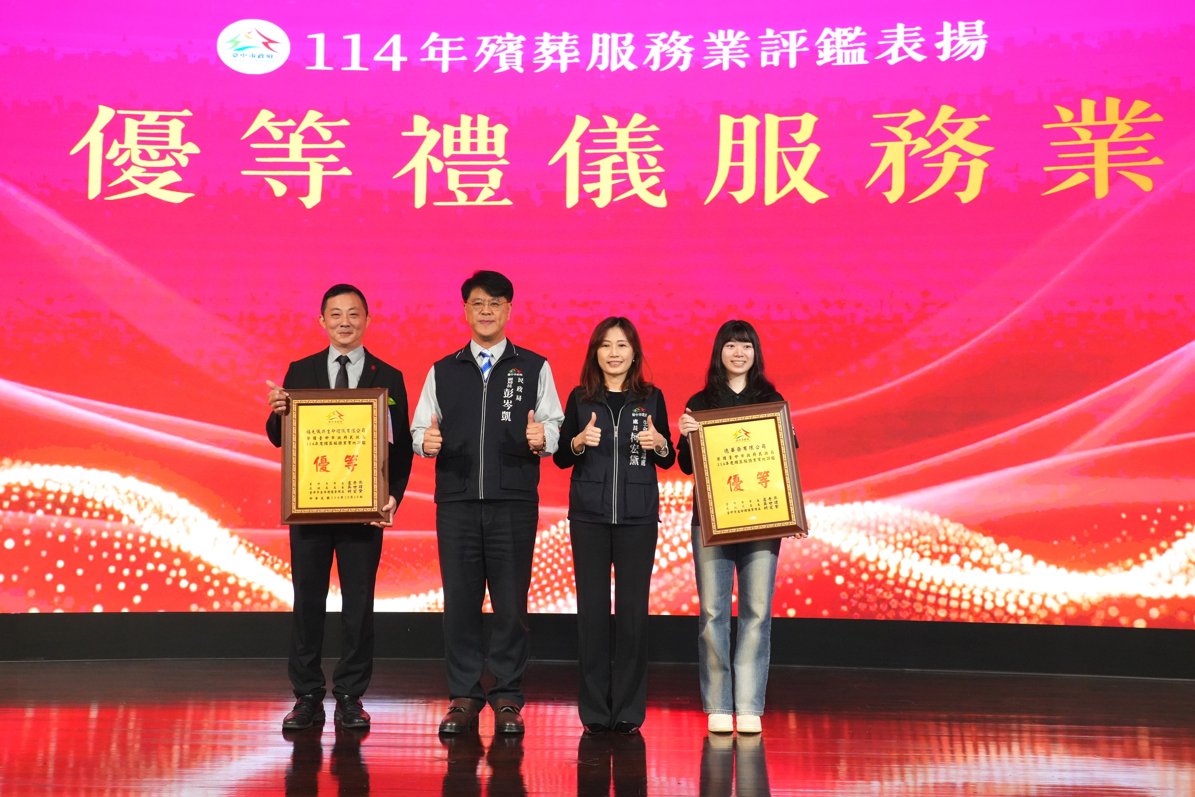 為提升殯葬服務品質並保障消費者權益,台中市政府每年分三大區域輪流辦理合法殯葬業者評鑑。今年針對第三區域(北區、中區、西區)120家禮儀服務業及9家私立殯葬設施進行評鑑,選出11家特優、2家優等及8家甲等業者,今(15)日在林皇宮舉行表揚典禮暨殯葬業務講習會。民政局副局長彭岑凱代表市長盧秀燕出席頒發獎牌,肯定業者投入生命事業的努力與創新,並期許持續精進服務,與市府攜手提供家屬更周全的協助。