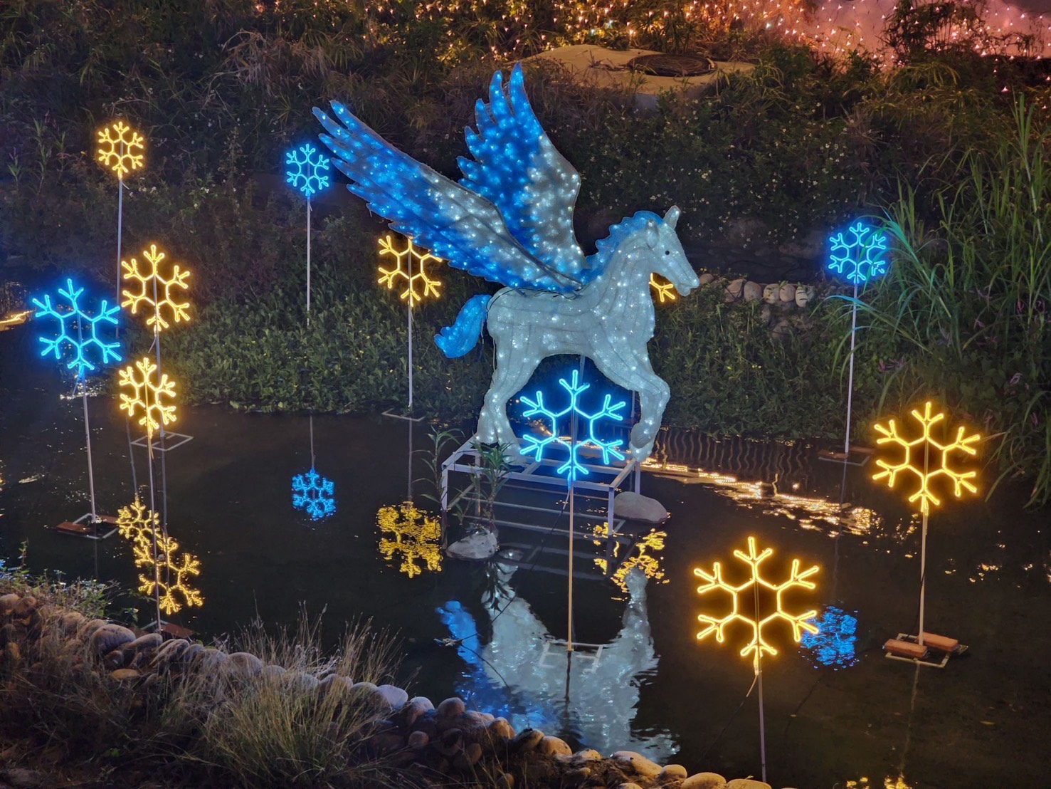 接續於明(17)日,豐原陽明市政大樓(豐原區陽明街)正式點亮聖誕樹、光瀑布及周邊燈飾,整點搭配飄雪效果,營造浪漫的「雪國聖誕」氛圍。當日同步亮燈的葫蘆墩圳(豐原區三豐路至三民路段及豐原國小前圓環),以「水岸飛馬・幸福葫蘆墩」為主題,融合耶誕、跨年、情人節與春節等節慶意象,運用飛馬、金色瀑布、願望光束、水岸花都等燈飾元素,透過光影律動展現多層次視覺效果,象徵「願望在豐原升空、幸福在水岸落地」,打造具節慶氛圍的特色水岸燈帶。位於豐原葫蘆墩公園第三、四區沿岸的軟埤仔溪燈區,則以童話、祝願與馬年寓意打造「水光聖誕」、「雪之心境」、「愛之緞帶」及「一飛衝天」四大光景,透過「光 × 水 × 倒影」形塑沉浸式散步體驗,吸引民眾於冬夜駐足觀賞。