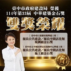 第33屆中華建築金石獎今年9月公布得獎名單,台中市政府建設局主辦的「台中市巨蛋體育館興建工程」與「台中市太平國民暨兒童運動中心興建工程」表現亮眼,分別榮獲規劃組與施工組金石獎,並雙雙奪下該組別最高榮譽「首獎」,締造「雙首獎」佳績。市府建設團隊日前更獲副總統蕭美琴接見,建設局由總工程司陳建權代表局長陳大田出席,展現台中市推動工程品質與城市美學的卓越成果。