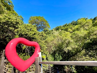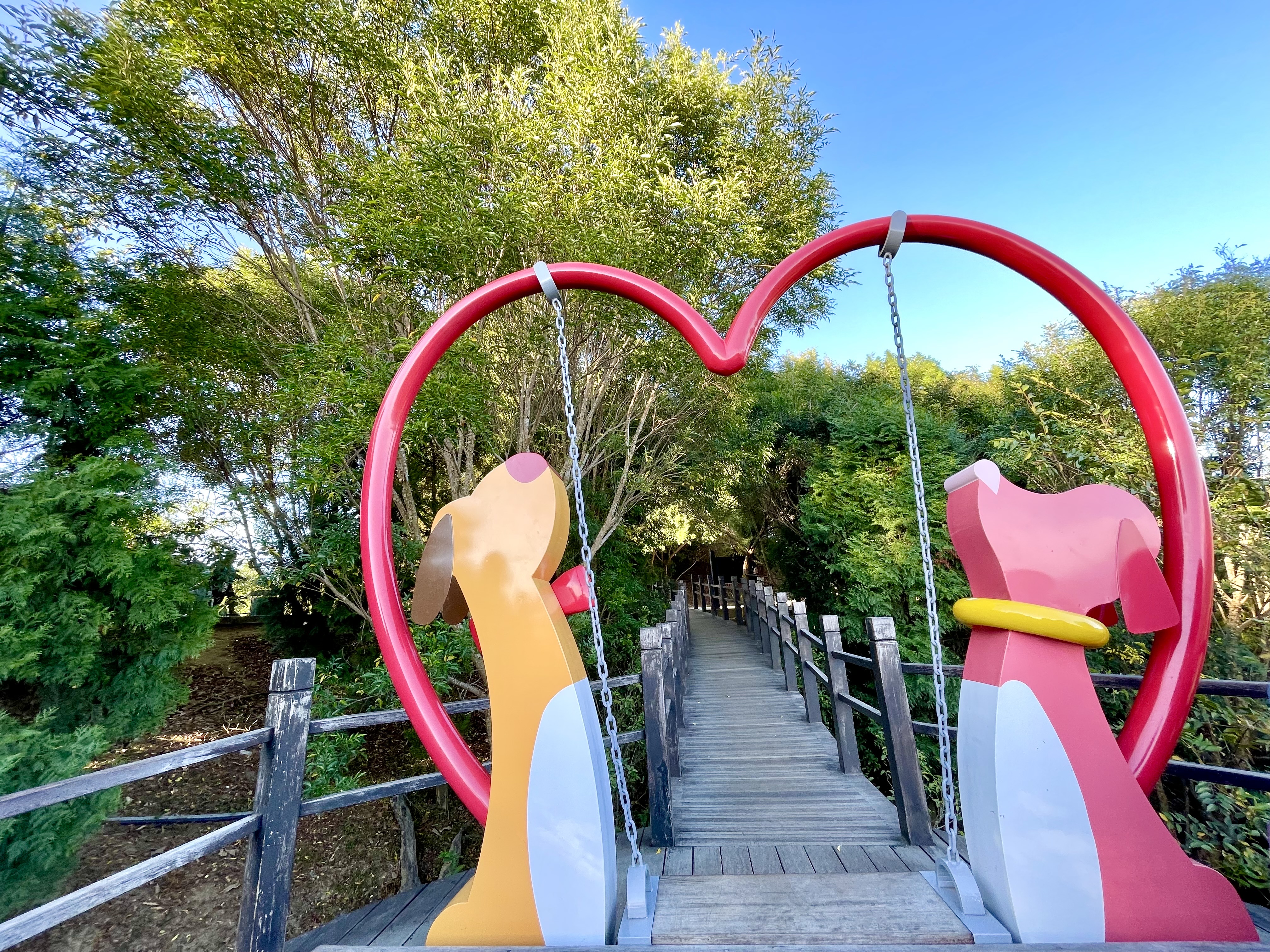 觀旅局進一步說明,為提升互動性與趣味性,步道沿線設置多處QR Code與甜蜜互動裝置,遊客可邊走邊掃描、閱讀故事內容,或留下合影紀念。來到山頂的「小狗鞦韆」時,不妨停下腳步,透過數位互動深入了解「小久」與「阿知」對未來的想像,或許也能在故事中,看見自己與家人、伴侶的影子。這不只是一趟爬山行程,更是一場與自己、與重要之人對話的心靈旅程。