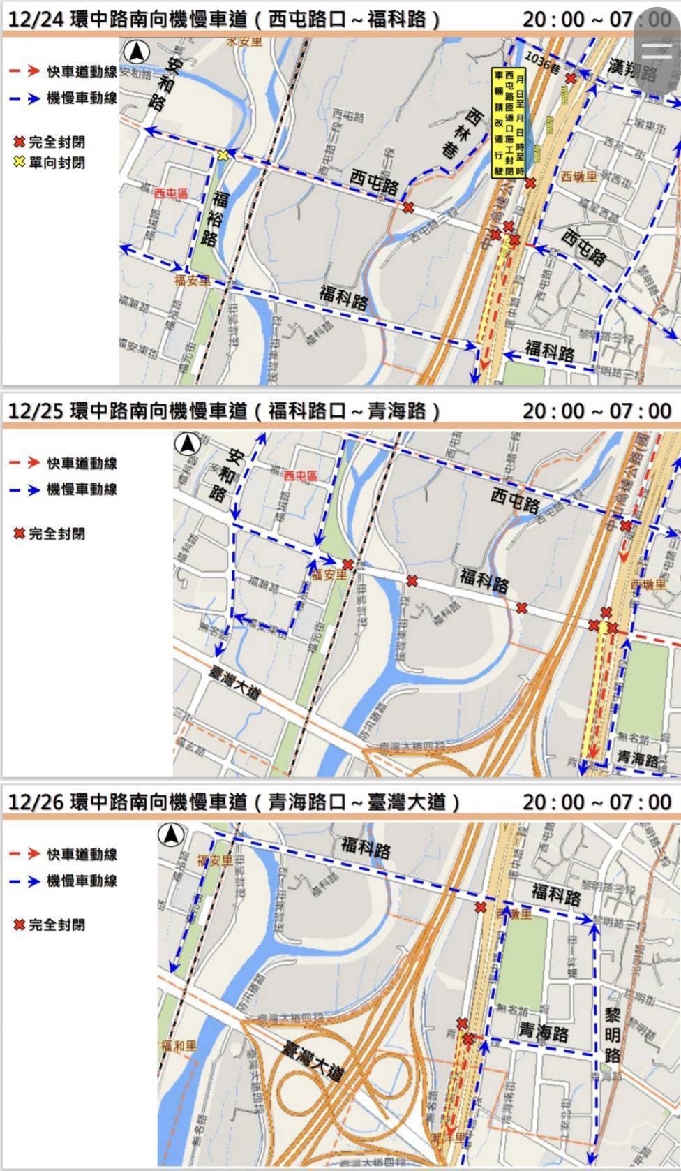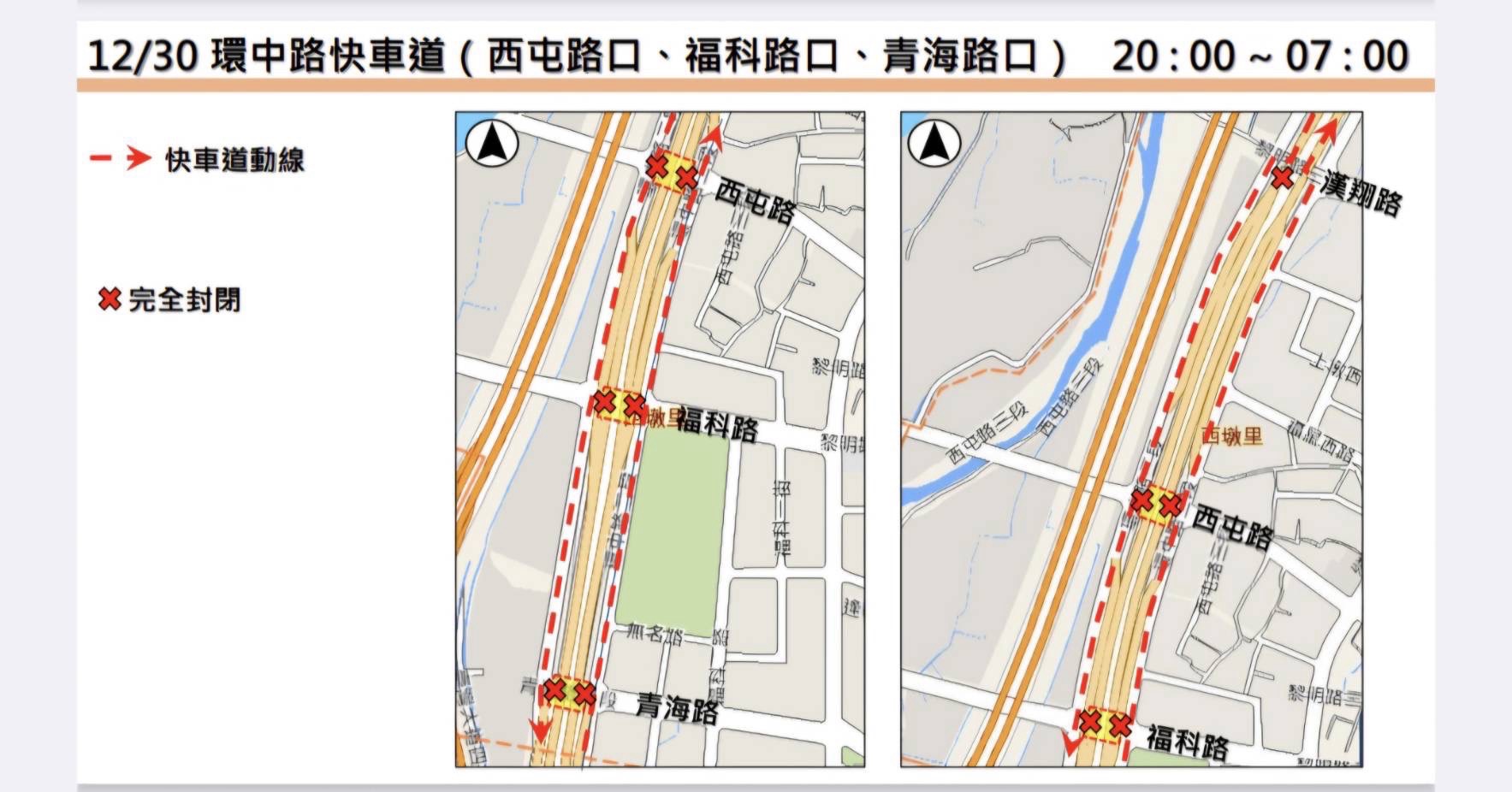 12月29日(週一)20時至12月30日(週二)7時:封閉西屯路閘道(北向)。