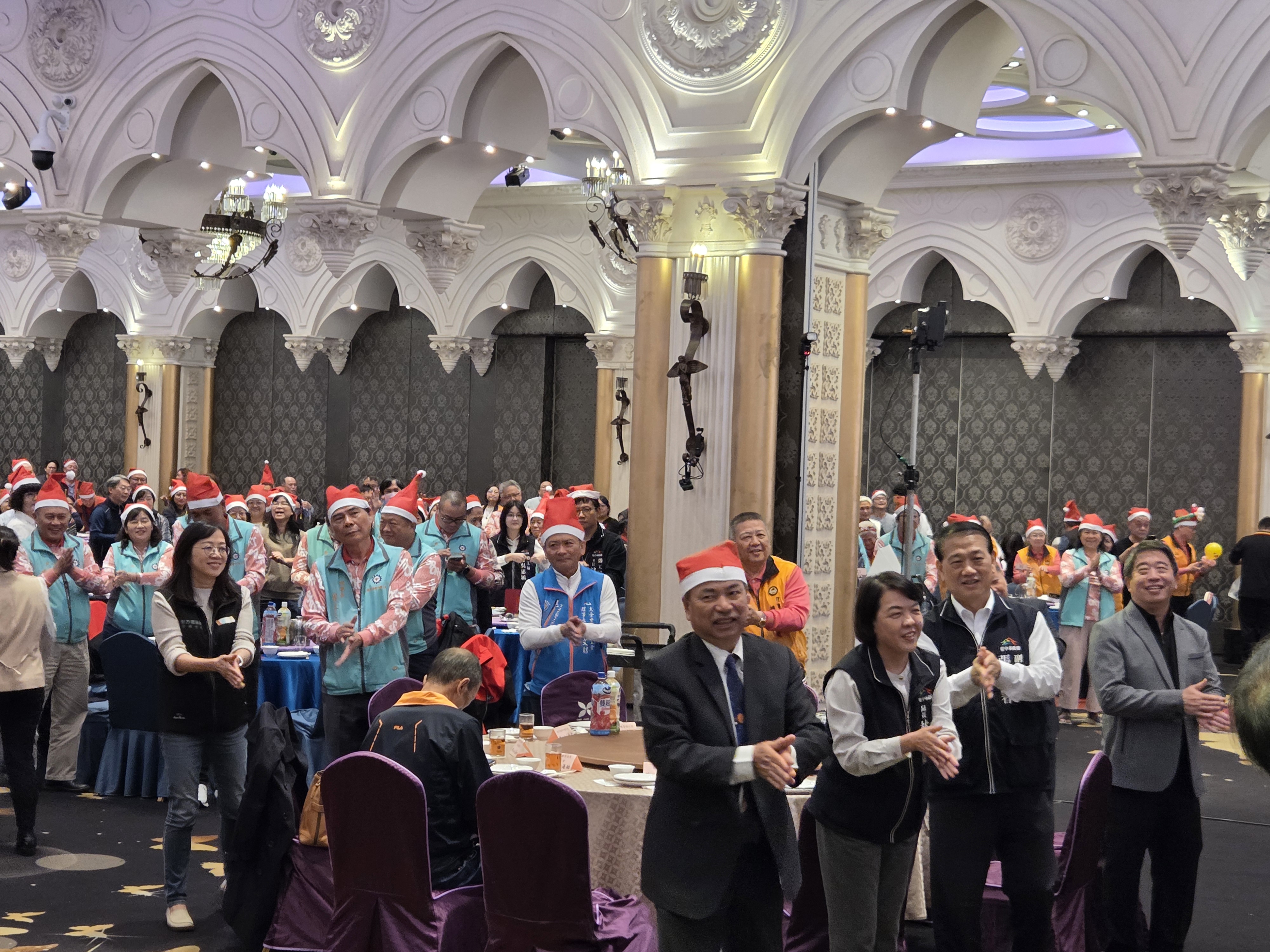 活動現場洋溢濃濃聖誕氣氛,氣氛溫馨熱絡。副秘書長張大春代表市長盧秀燕出席,向工會夥伴表達誠摯感謝,肯定工會長期以來與市府攜手合作、共同為勞工朋友打拚,並與現場貴賓一同為新的一年祈福,展現市府與勞工團體並肩同行、互信互助的夥伴關係。