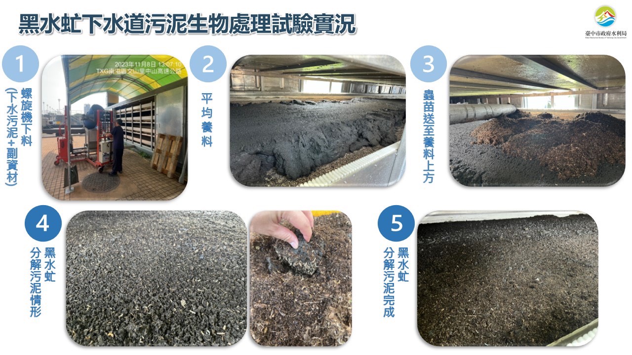 水利局長范世億說明,過往廢棄污泥多以焚燒或掩埋方式處理,不僅處理成本高,也伴隨能源消耗與碳排放等環境負荷。市府與國立台灣大學研究團隊合作,利用黑水虻幼蟲分解有機質的生物特性,於自動化系統中進行污泥生物處理,並實際導入水資源回收中心進行長期運轉驗證,作為低碳污泥處理的創新示範。