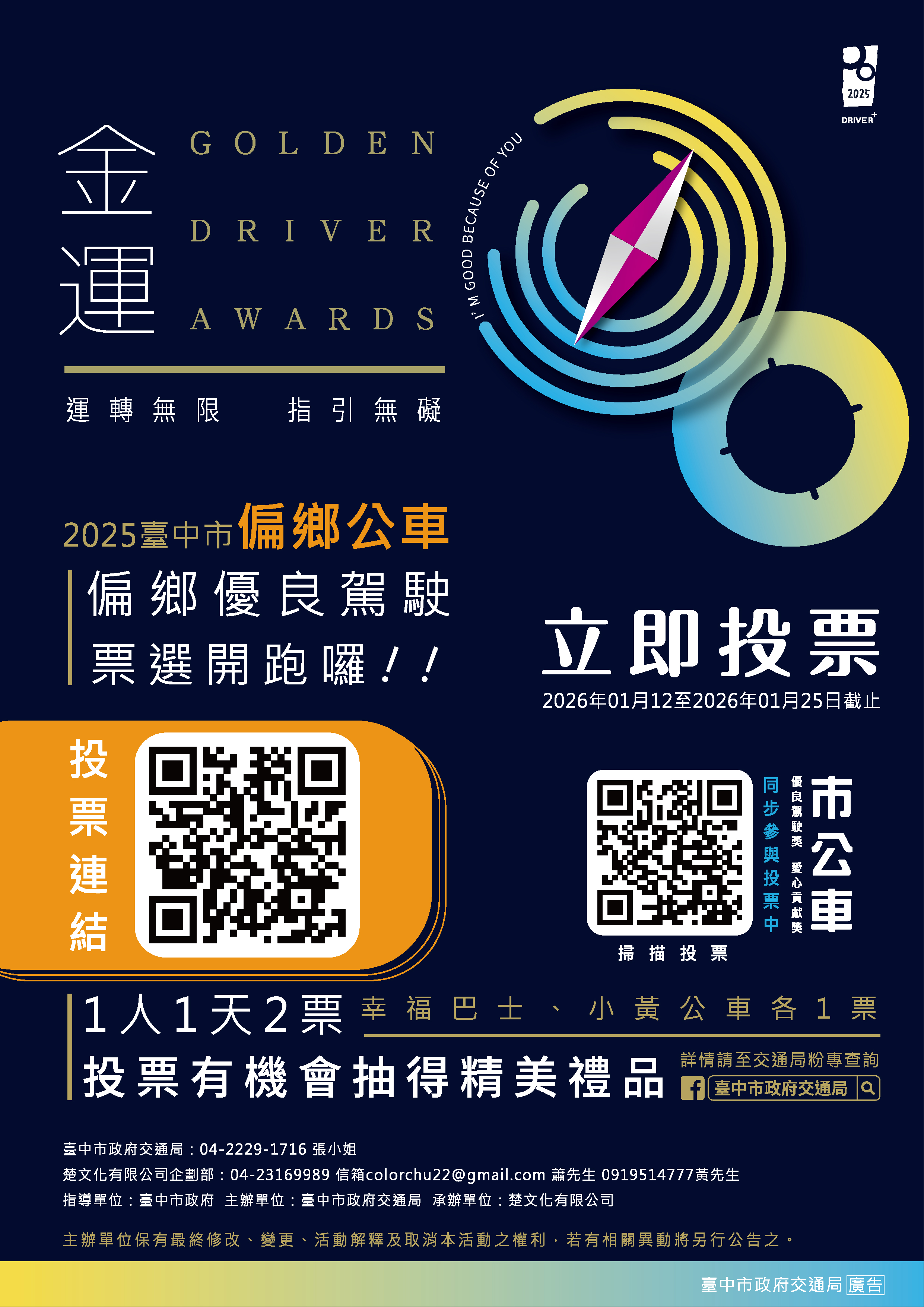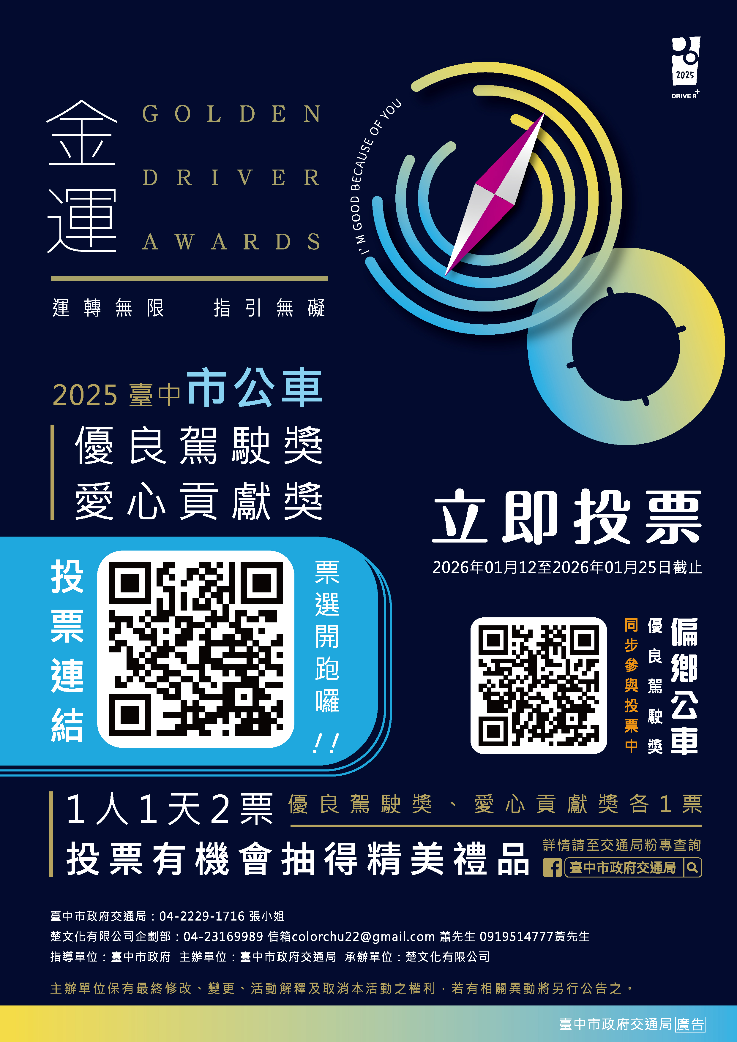 交通局表示,自1月12日起民眾可掃描金運獎投票活動海報上的QR碼,或點擊「台中市即時公車動態資訊」( https://citybus.taichung.gov.tw/ )及「台中Go」APP「最新消息」的連結,前往活動網站了解入圍駕駛員們的優良事蹟並進行投票。交通局為感謝市民熱心參與,同時進行2025金運獎限量悠遊卡抽獎,投票活動截止日為1月25日,請市民朋友共同為「金」正讚的駕駛員加油打氣。