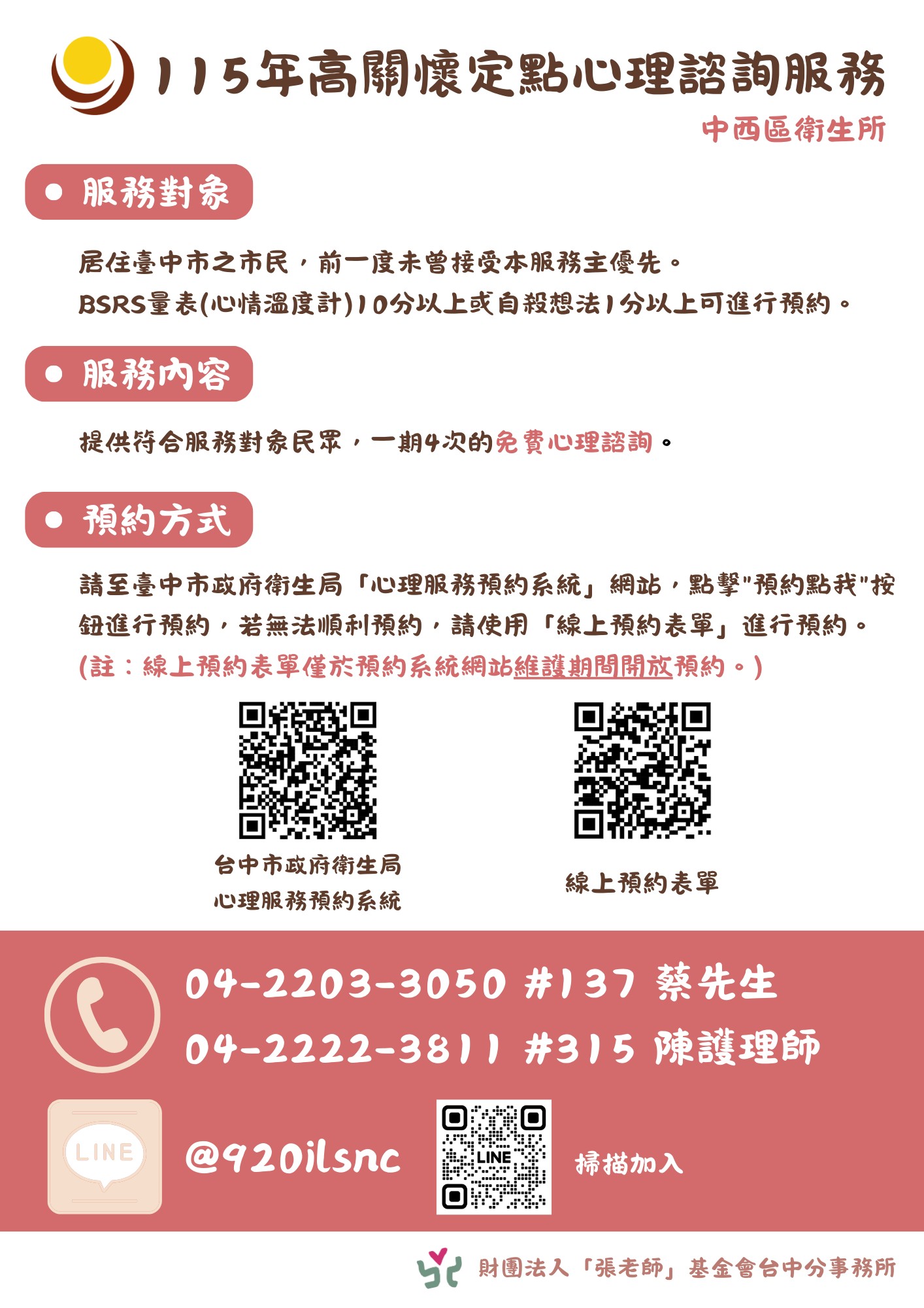 115年度中西區衛生所-定點心理諮商 115年度心理諮商開始報名了 報名方式 1. 掃表單上的QR code 填報預約單。或線上連結 :https://mental.health.taichung.gov.tw 若有任何問題,可致電04-22223811或臨櫃協助。