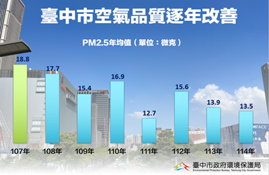 在各項政策與科技治理並進下,台中市PM2.5從107年的18.8微克,改善到114年(統計至11月)的13.5微克,改善幅度接近3成。展現治理方向與具體成果,市府也將持續朝國家空氣品質標準12微克目標邁進,為市民打造更健康宜居的城市。