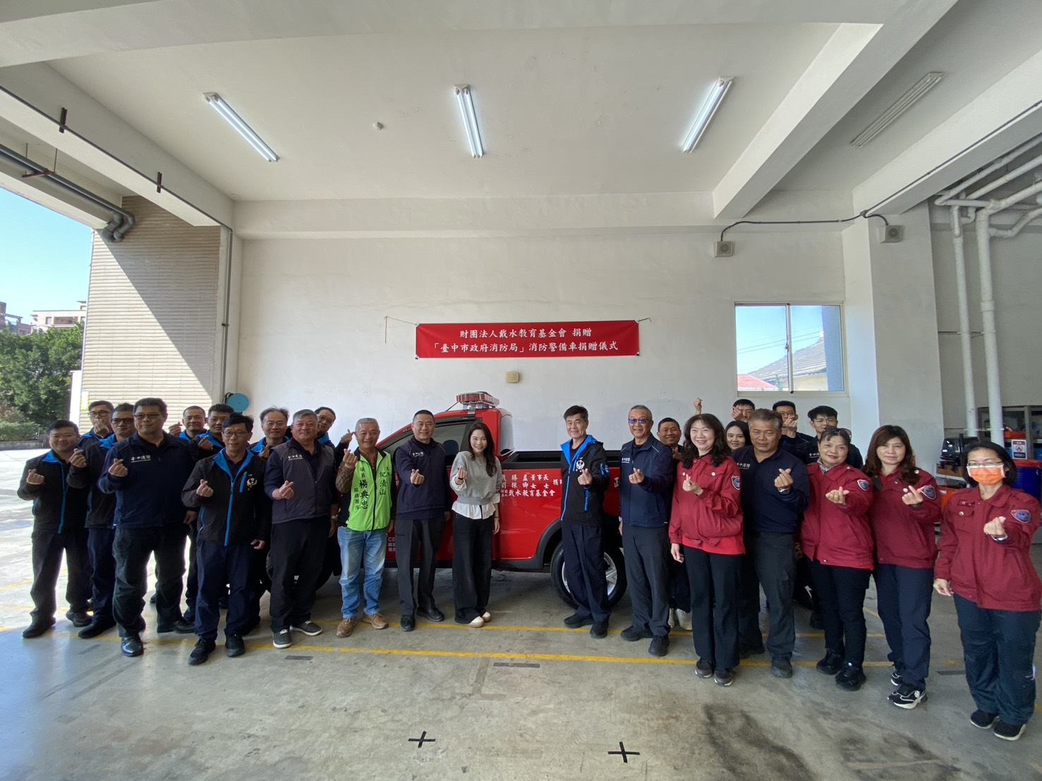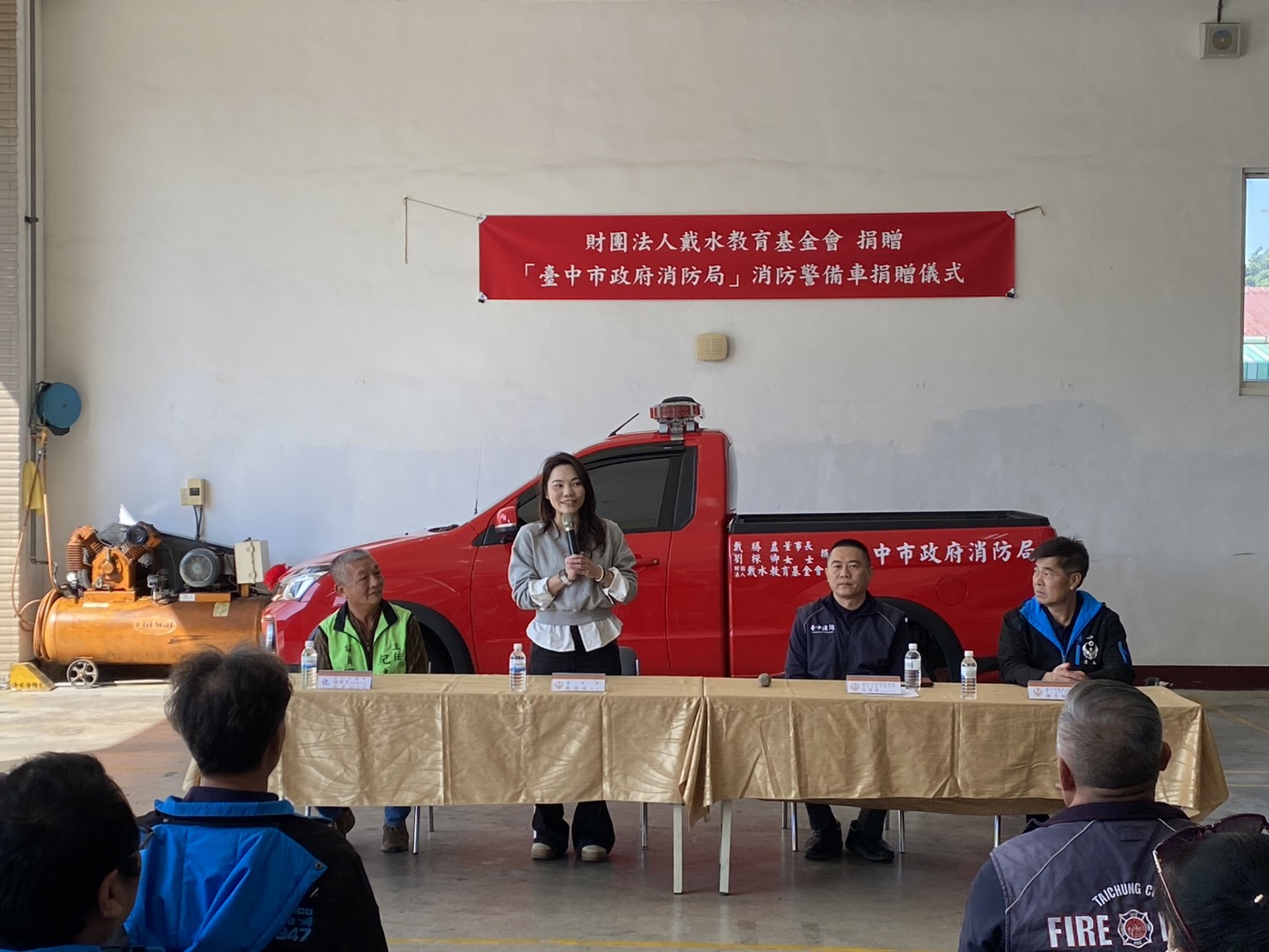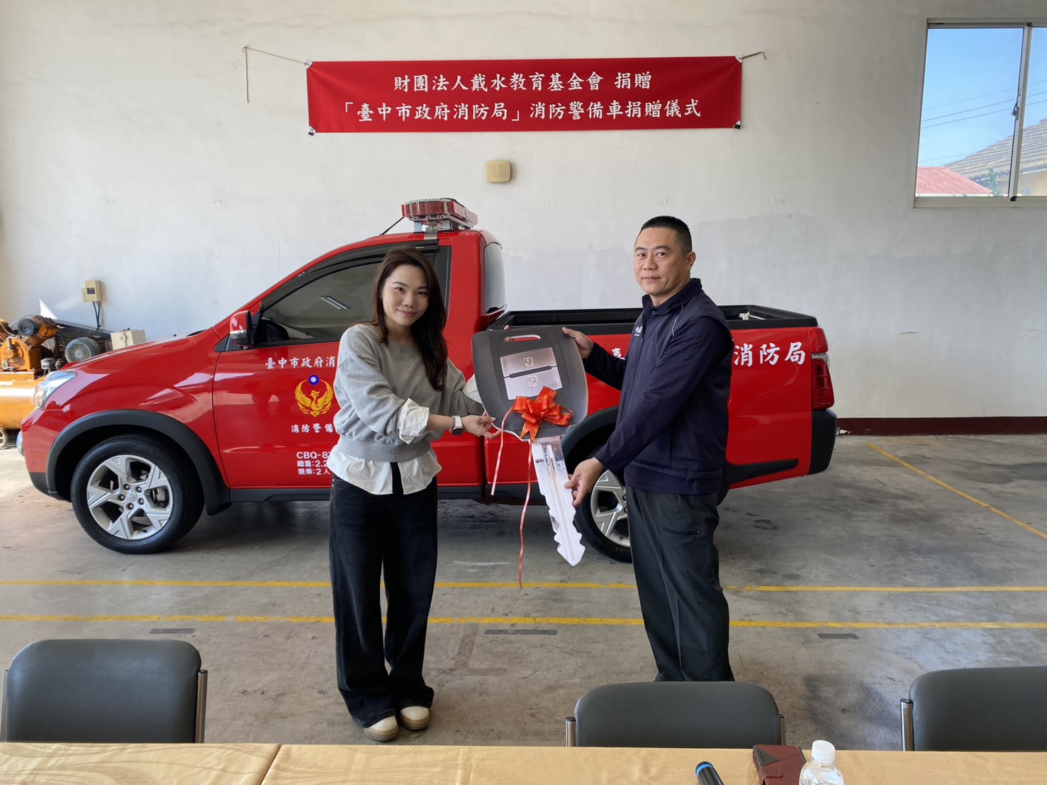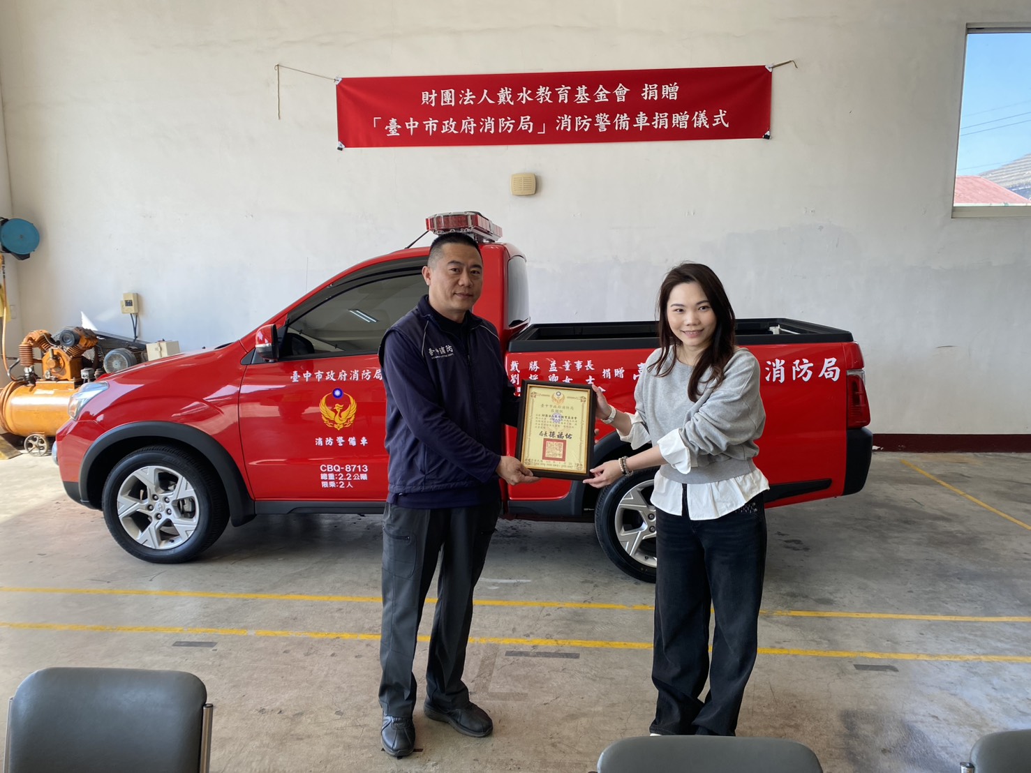財團法人戴水教育基金會秉持「推動公益、關懷社會」的宗旨,今(20)日上午於台中市政府消防局清水消防分隊舉行捐贈儀式,捐贈消防警備車1輛,提升第四救災救護大隊清水分隊救災戰力,由副大隊長許修豪代表受贈並回贈感謝狀,感謝基金會及董事長戴勝益對消防工作的熱心支持,展現財團法人回饋鄉里的具體行動力。