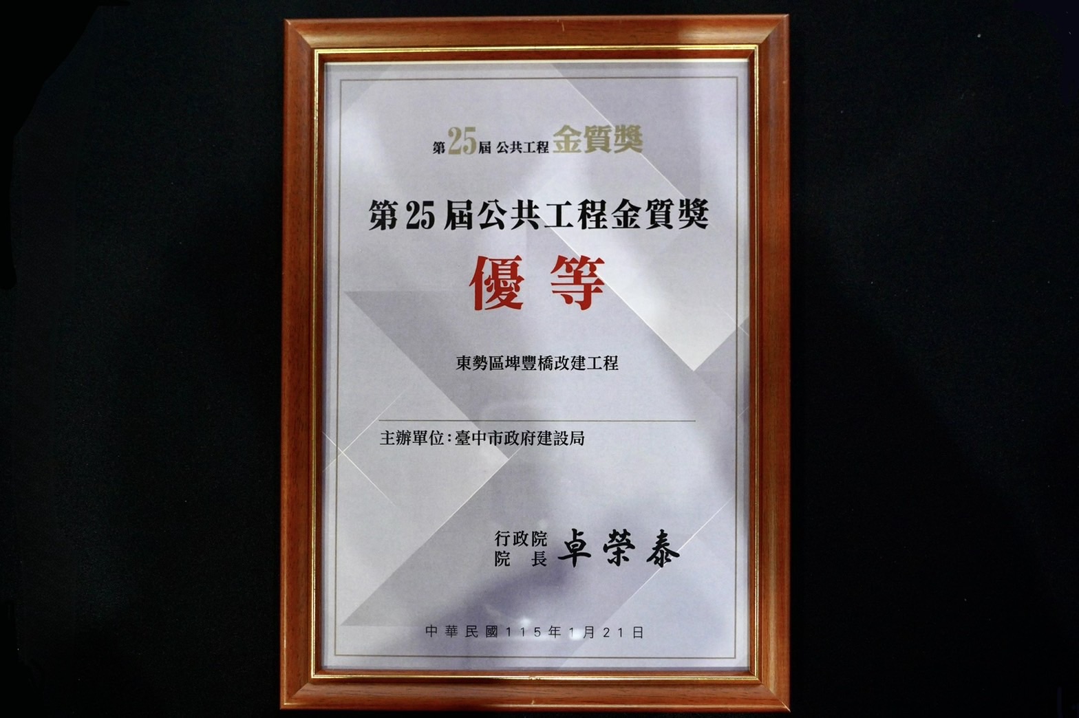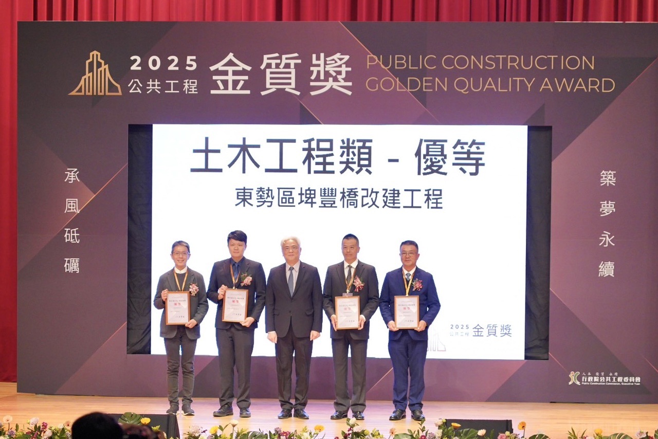 行政院公共工程委員會昨(21)日舉行第25屆公共工程金質獎頒獎典禮,台中市政府建設局以「東勢區埤豐橋改建工程」榮獲土木工程類優等殊榮;同時,建設局長陳大田因長期推動優質公共工程、成效卓著,獲頒全國唯二的「公共工程專業獎章」,為台中市公共建設再添榮耀。