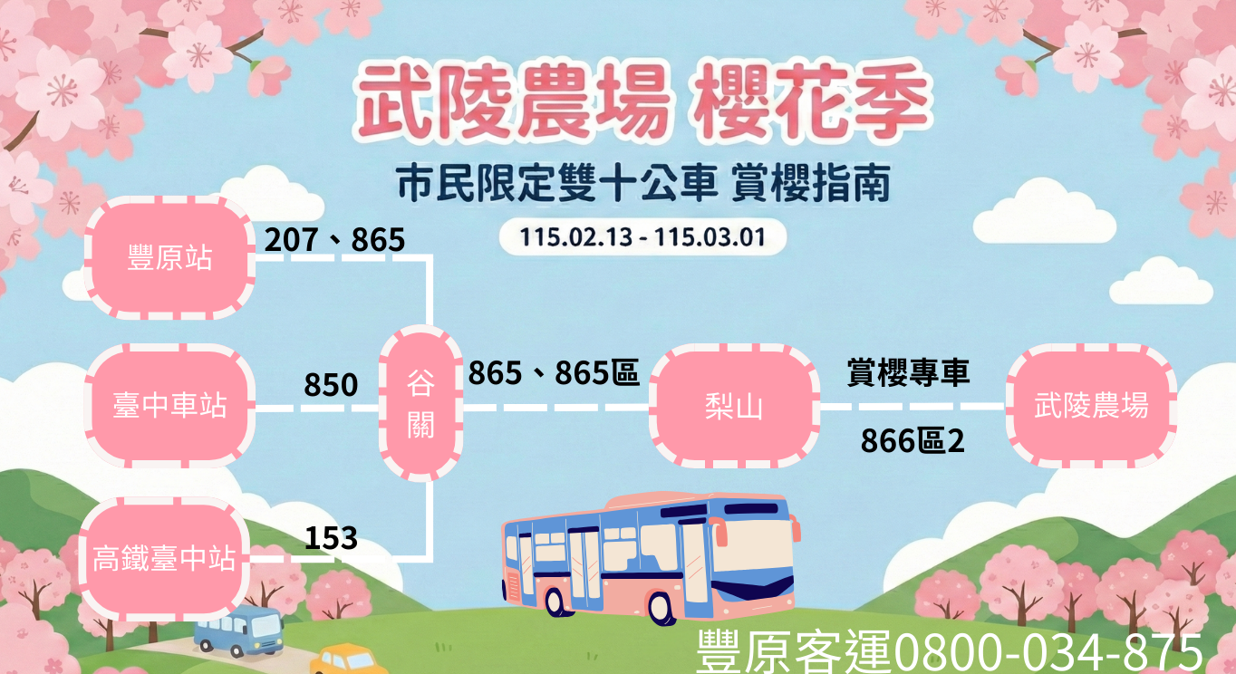 更多接駁資訊可至豐原客運官網查詢,或撥打豐原客運客服專線詢問(04-25234175);武陵農場櫻花季交通管制措施詳情可至「公路局115年武陵農場櫻花季疏運專頁」查詢( https://reurl.cc/G5DgVp )。