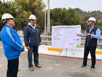 彭副局長視察時,除實地了解桐林里中坑巷農路邊坡復建及峰谷二號旁護岸工程的施工進度與工法外,也特別關切施工期間的交通動線與用路安全,要求施工單位確實落實交通維持計畫及工地安全管理,兼顧居民日常通行與農產運輸需求,並指示在確保工程品質與施工安全的前提下,妥善控管工期、加速推動施工,務必於汛期前完成相關工程,降低豪雨期間對地方生活及產業造成的影響。