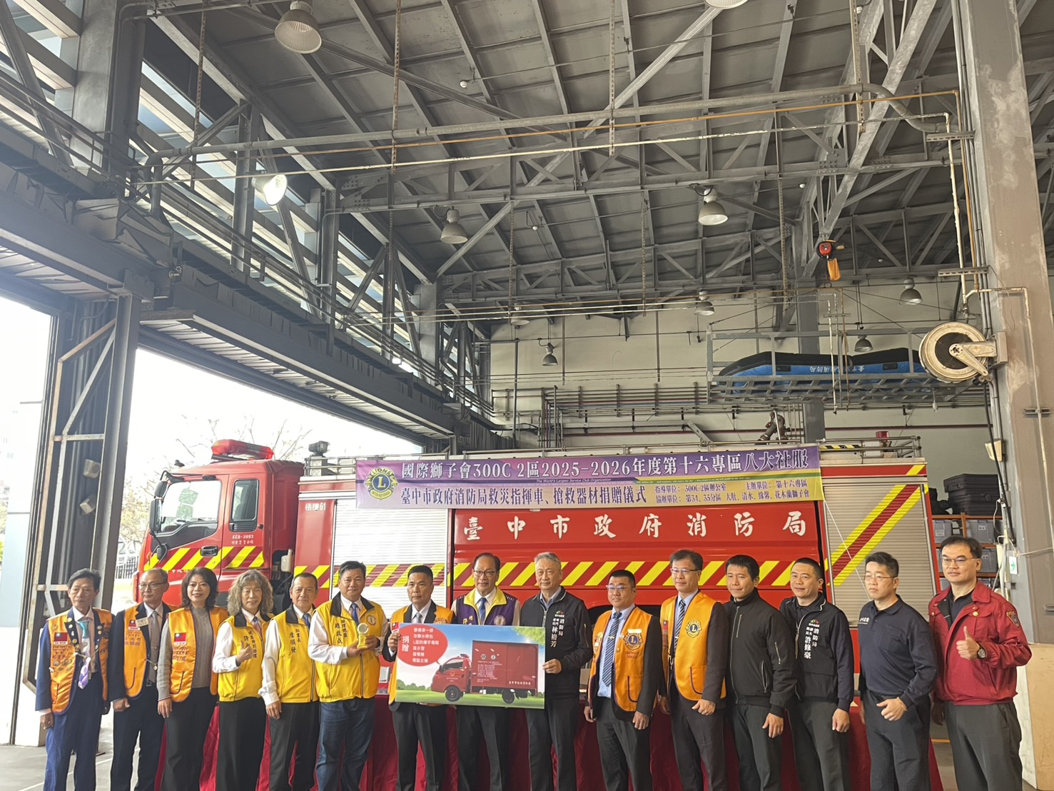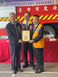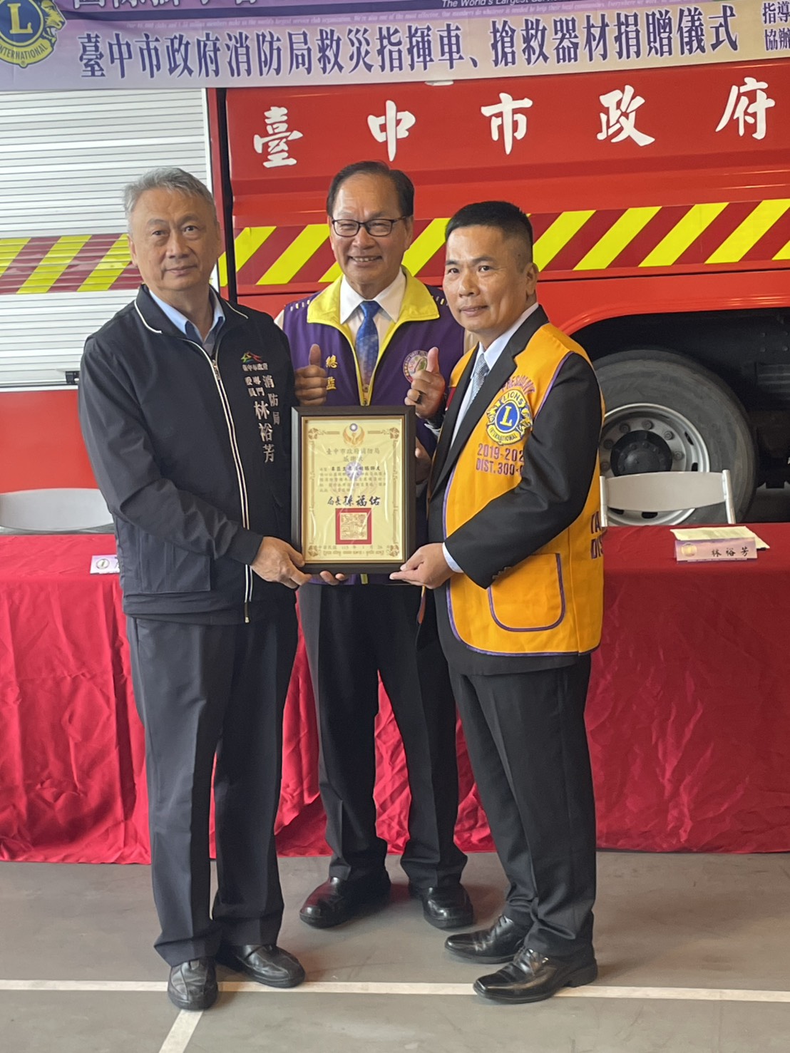 國際獅子會300 C2區第16專區秉持熱心公益、回饋社會的精神,捐贈台中市政府消防局第四救災救護大隊消防警備車1輛及救災裝備器材1批,並於昨(26)日上午10時,在消防局第四救災救護大隊梧棲分隊舉辦捐贈儀式,由消防局專門委員林裕芳代表受贈,並回贈感謝狀,表達誠摯謝意。