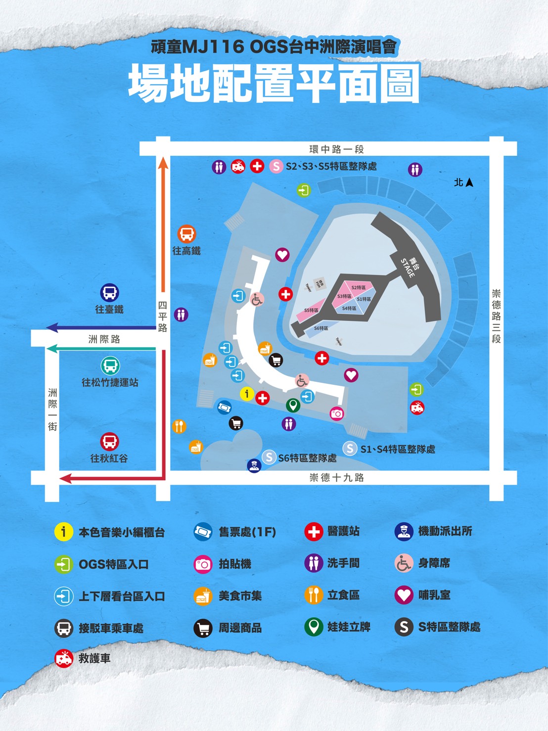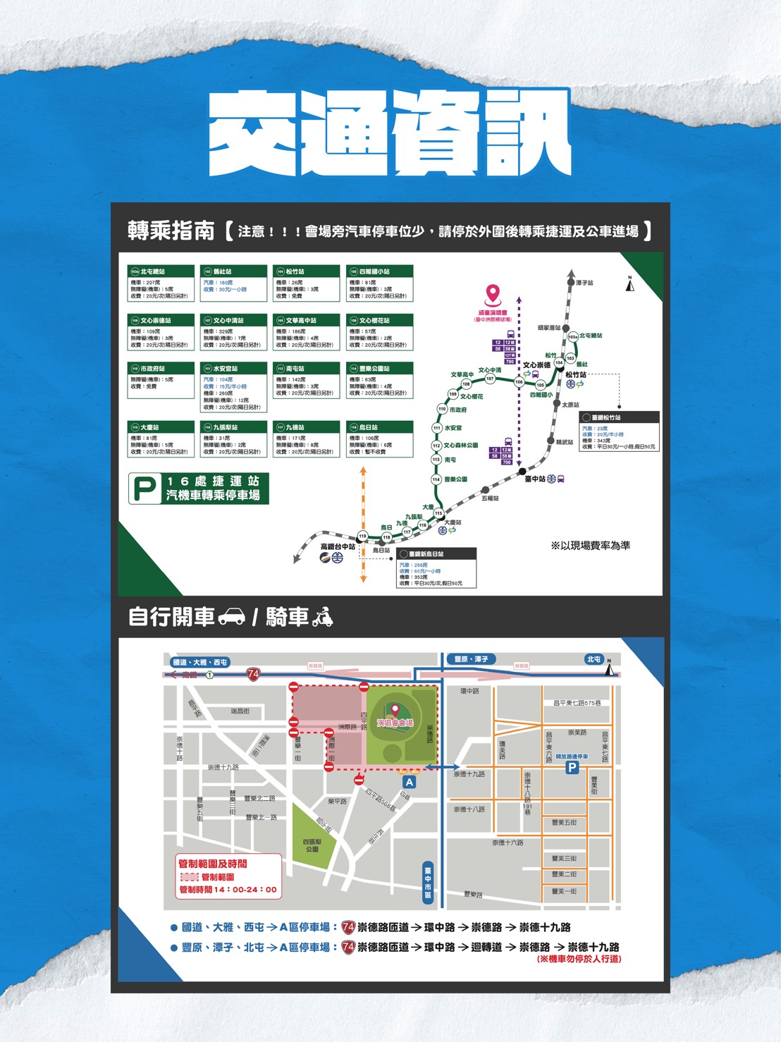 配合演唱會進行,活動兩日將自14時起,實施周邊道路交通管制,管制路段包括四平路(環中路至568巷)、洲際路(四平路至豐樂一街)及崇德十九路(崇德路至洲際一街)等,請一般車輛配合改道行駛,相關措施將依現場人流狀況彈性調整,儘速解除交通管制。