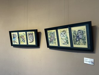 本次展出的藝術家創作媒材多元,主題以貓頭鷹居多,精選多幅色鉛筆畫作及壓克力顏料彩繪作品