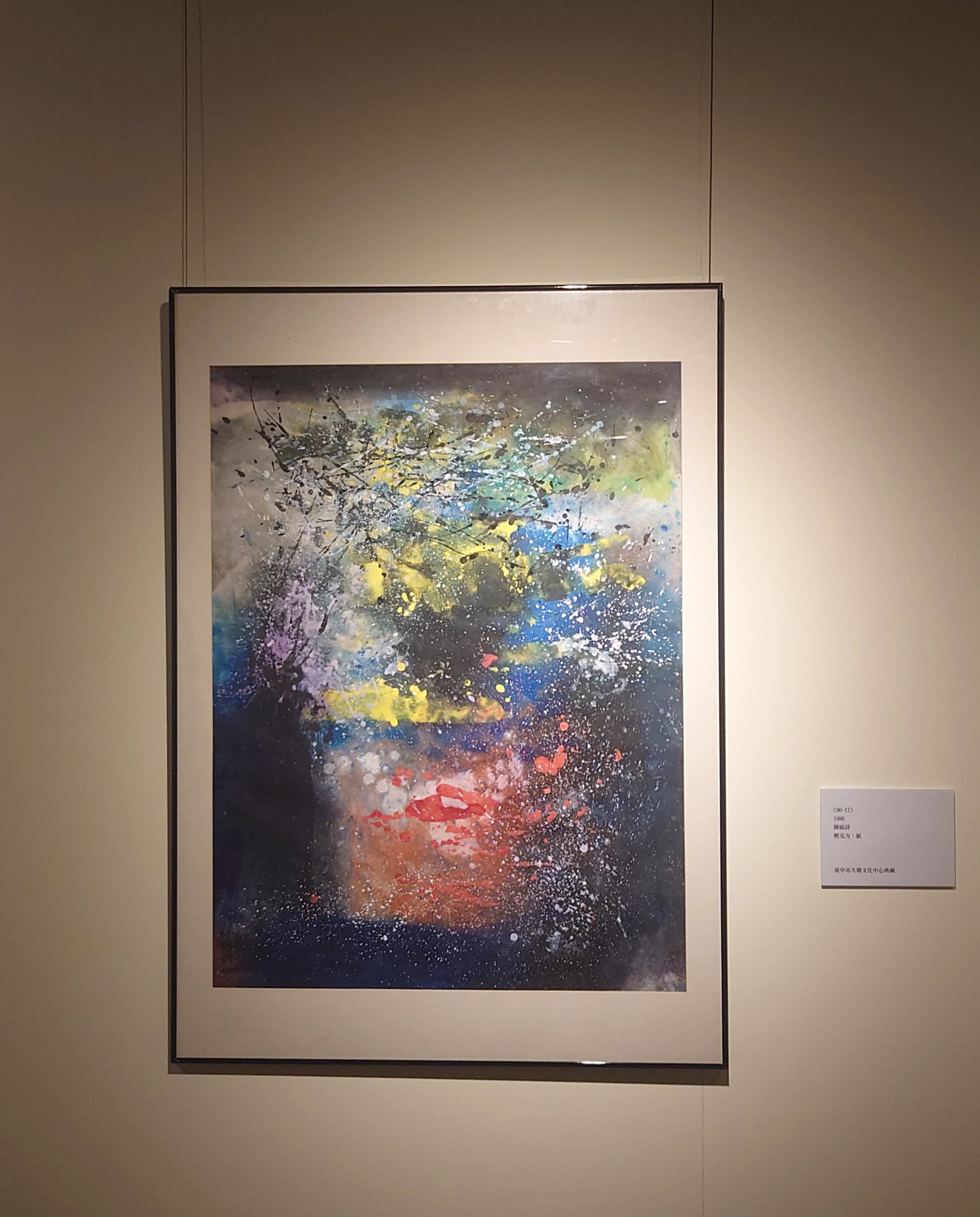 展覽的一大亮點為陳庭詩旅美返台的壓克力畫作,這時期的陳庭詩受到西方抽象表現的影響,約於1986年前後,開始嘗試壓克力的新興媒材,並採用自動性技法創作,刻意抹除實物造型與明顯邉形,利用色彩對比與潑灑斑點,營造出獨特的視覺空間感。其作品多不命名,而以創作年份與件數作為編碼,〈86-17〉,即代表1986年的第17件作品,而這份純粹則留給了觀眾更多自由想像的空間。