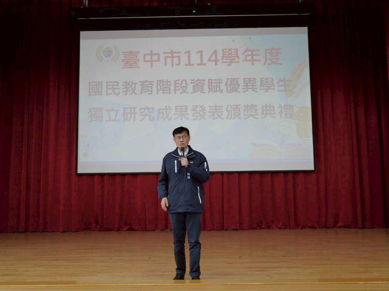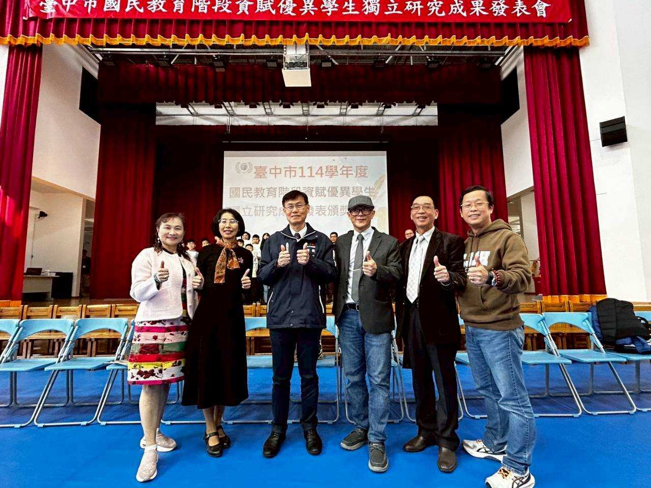 台中市政府教育局今(29)日在成功國中舉辦「114學年度國民教育階段資優學生獨立研究成果發表會」,共計131件研究作品投稿,經專家學者審慎評選後,選出5件特優、8件優等、11件甲等及9件佳作,合計33件優秀作品、118位學生及指導教師獲獎。教育局長蔣偉民親自出席頒獎典禮,並邀請獲獎學生進行成果發表、指導教師分享教學歷程,現場學術交流氣氛熱絡。