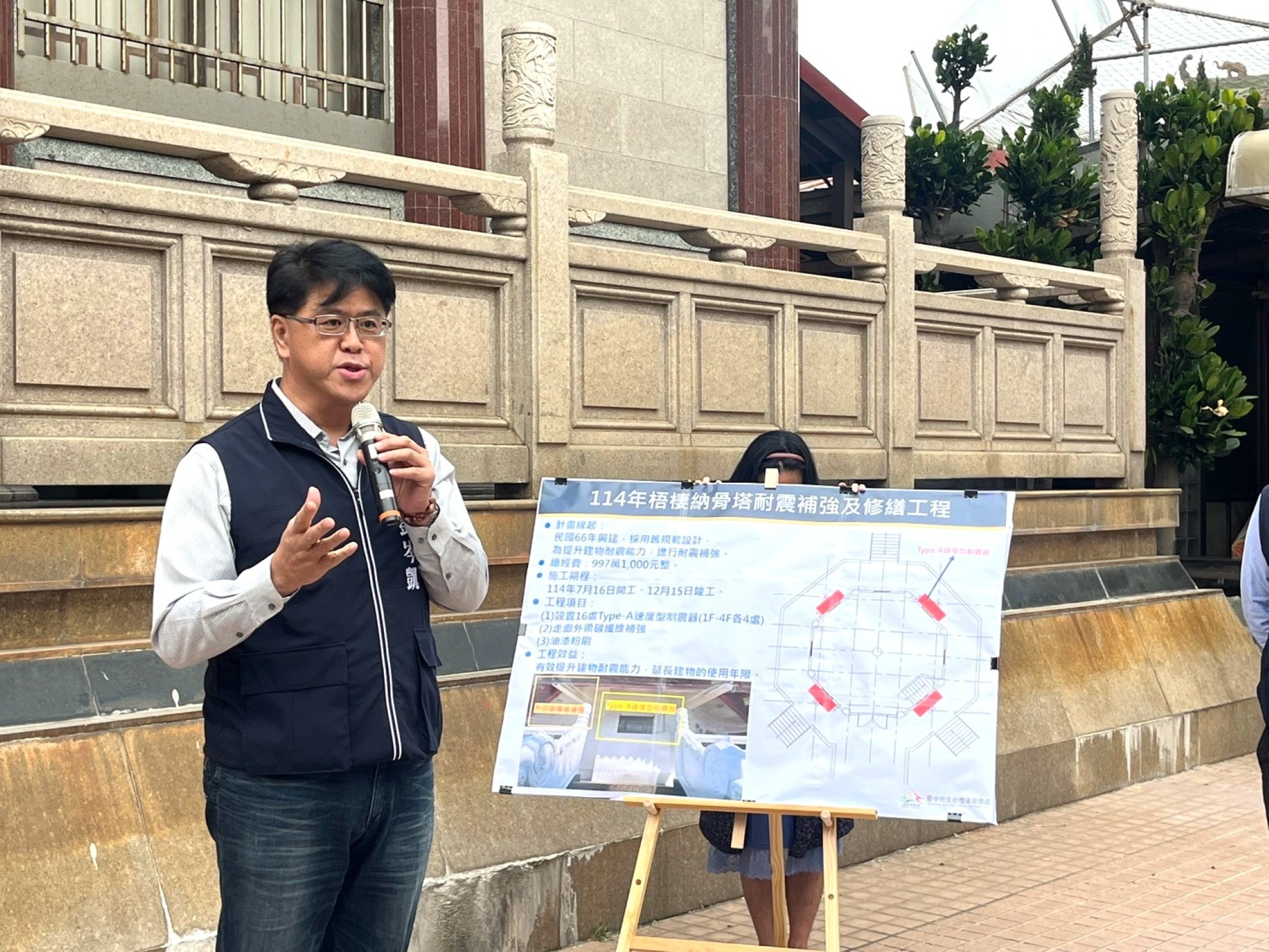 台中市梧棲納骨塔於民國66年建成,為地下1層、地上7層的八角形建築物,使用迄今近50年,因原耐震設計標準較低,經評估鑑定需進行耐震補強。對此,台中市政府投入總經費997萬1,000元,於去年7月啟動補強並於同年底順利完工,全面提升建築安全與使用韌性。民政局副局長彭岑凱近日前往視察補強成果,肯定台中市生命禮儀管理處用心投入與品質把關,並強調市府將持續以最高標準守護市民追思祭祀場域,確保先人安息、民眾安心。