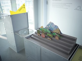 其中,連接美術館與圖書館的二樓連通橋設有一支望遠鏡,低頭可俯瞰大廳人流,捕捉建築中流動的節奏;美術館三樓斜坡一隅,望遠鏡對向美術館大廳,作品在光影中,細膩呈現時間推移下的光線變化。來到美術館五樓,望遠鏡藏身於C展覽室旁的外掛梯中,搭配兔子造型椅,彷彿一處秘密休憩角落,可遠眺文化之森與城市天際線,邀人靜靜停留。