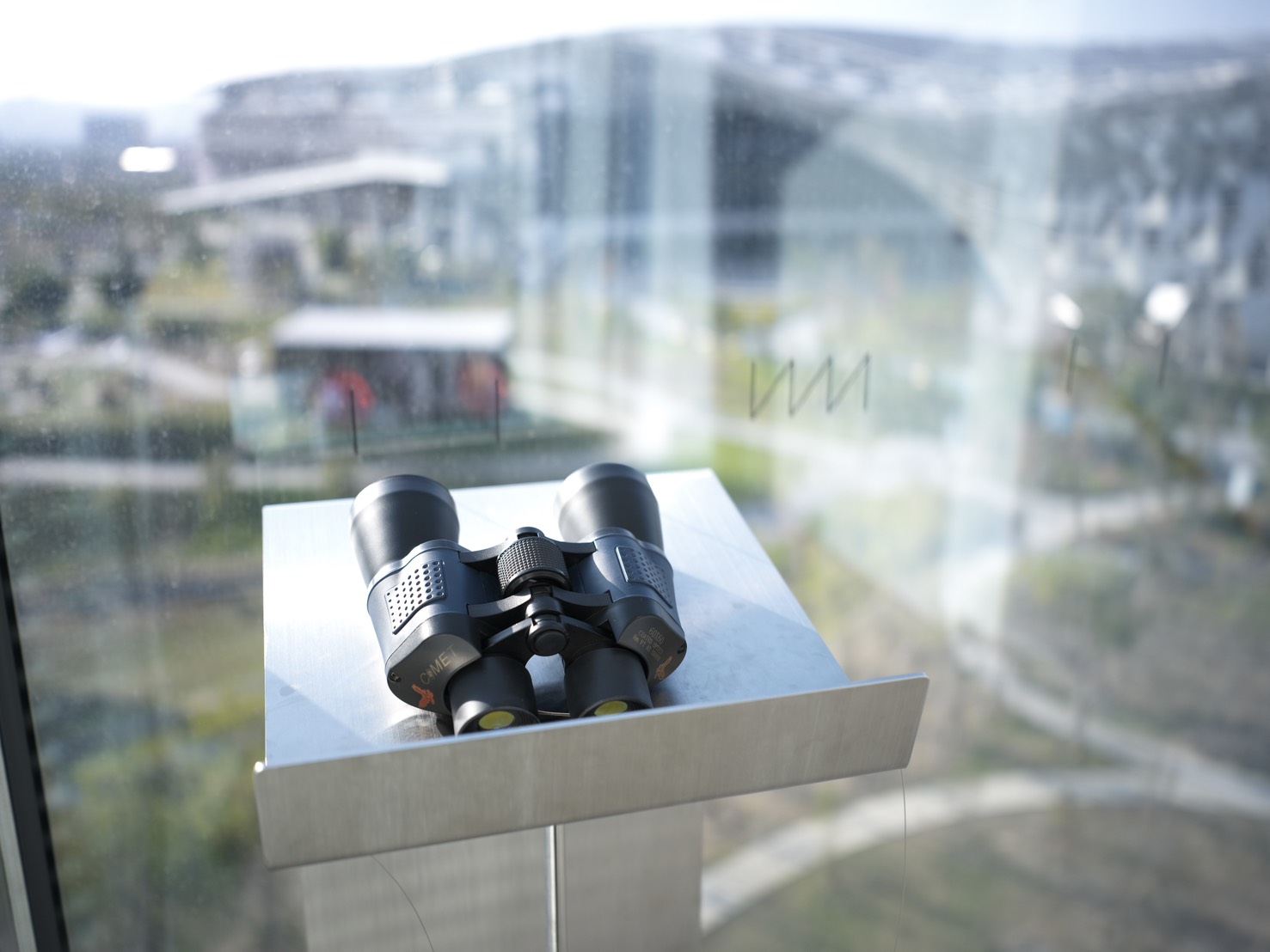 走進綠美圖,只要放慢腳步、細細觀察,便能發現館內共設置5支望遠鏡,這是臺中市立美術館開館展「萬物的邀約」展場特別設計的巧思,分布於動線轉折或開窗對景的位置。觀眾可透過望遠鏡穿越展牆、眺望戶外景色,讓視線從作品延伸至自然與城市,帶領大家體驗一段關於人、環境與城市關係的感知與對話。